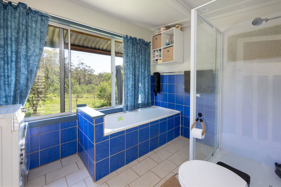 Complementing the main dwelling is a charming self-contained cabin, ideal for guest accommodation, extended family, or a peaceful private retreat. Finished with Colorbond walls and roofing, the cabin features a combined kitchen and living space, a spacious bedroom with ceiling fan, and just outside, a unique outhouse complete with bathtub framed by deep blue tiles, a shower and a washing machine adding character and convenience in equal measure.