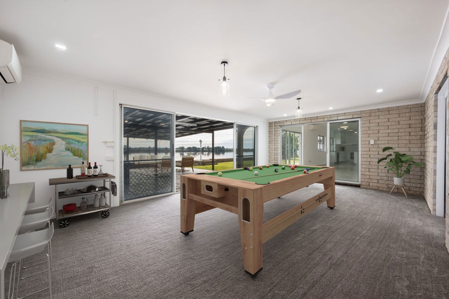On the ground floor, refined living continues with a formal lounge and dining room, a generous rumpus, a refreshed bathroom, an additional bedroom/office, an internal laundry and the showpiece kitchen overlooking the river, completed with stone benchtops, a walk-in pantry, an induction cooktop and a dishwasher. A self-contained studio with kitchenette, ensuite and carport access provides exceptional flexibility for guests, extended family or short-stay accommodation.