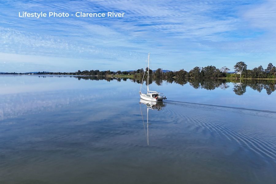 Set across 1.17 hectares (2.89 acres), the property commands an extraordinary 400+ metres of uninterrupted frontage along the Clarence River - a scale and position rarely found and seldom repeated. Designed to embrace its surroundings, the estate offers complete privacy, expansive open space and a lifestyle shaped by water, light and calm.