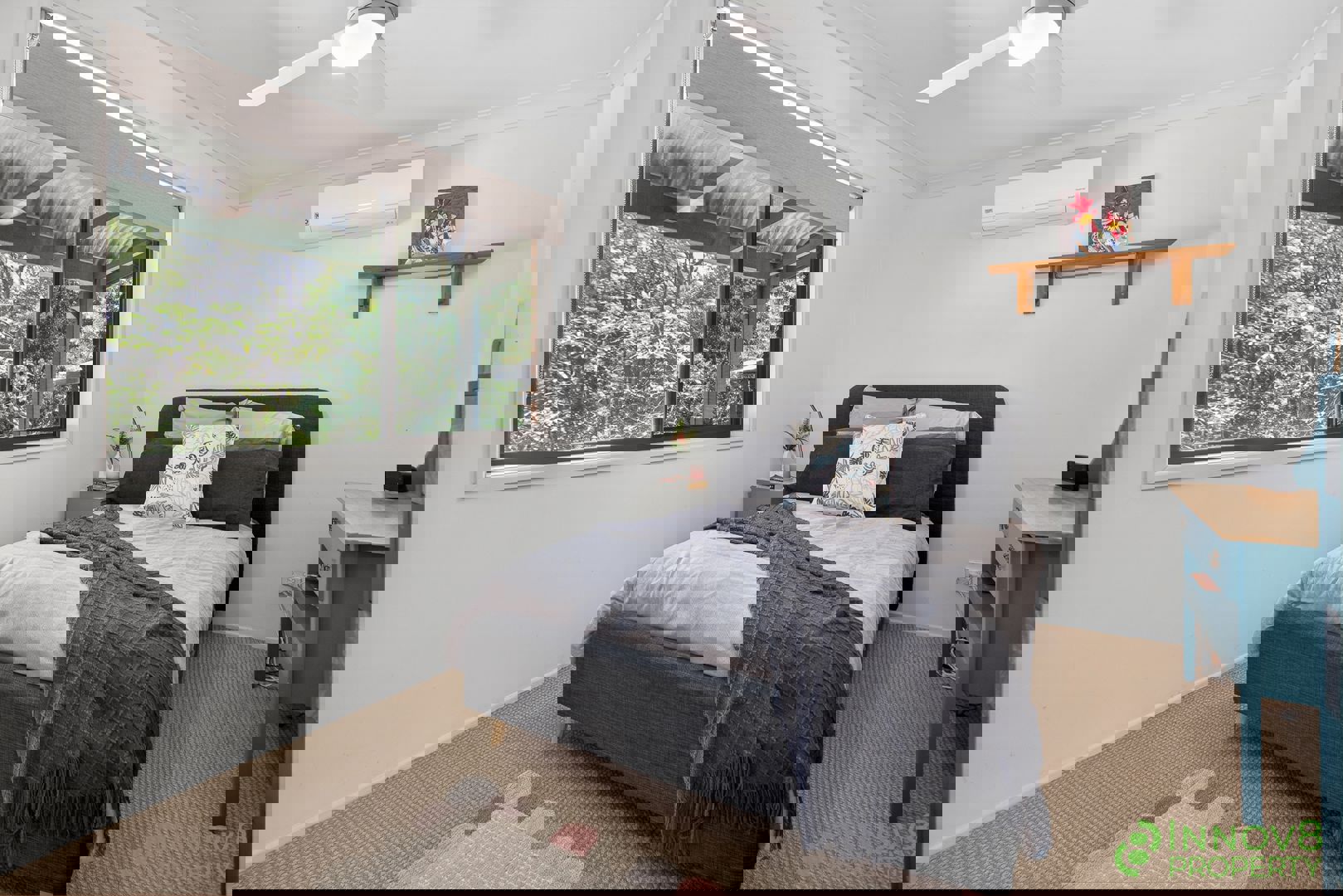 • Lower level includes two bedrooms with built-in robes (one with air-conditioning and a ceiling fan)