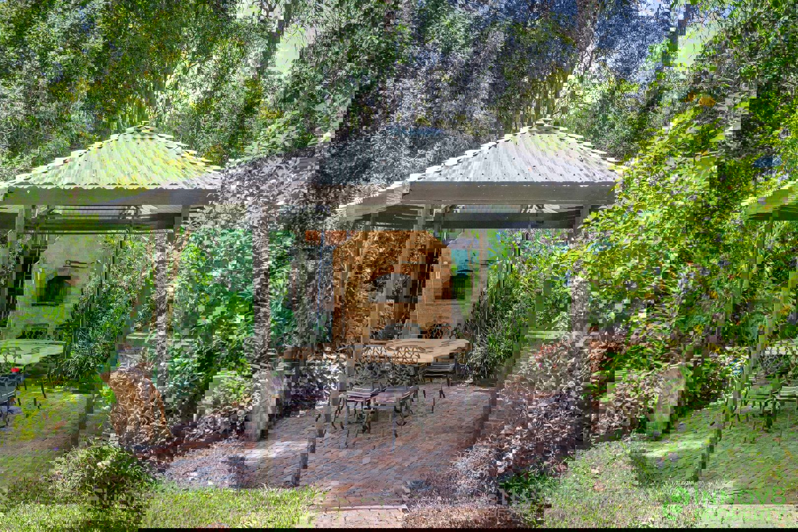 • Rear gazebo with a large pizza oven and a bricked in BBQ