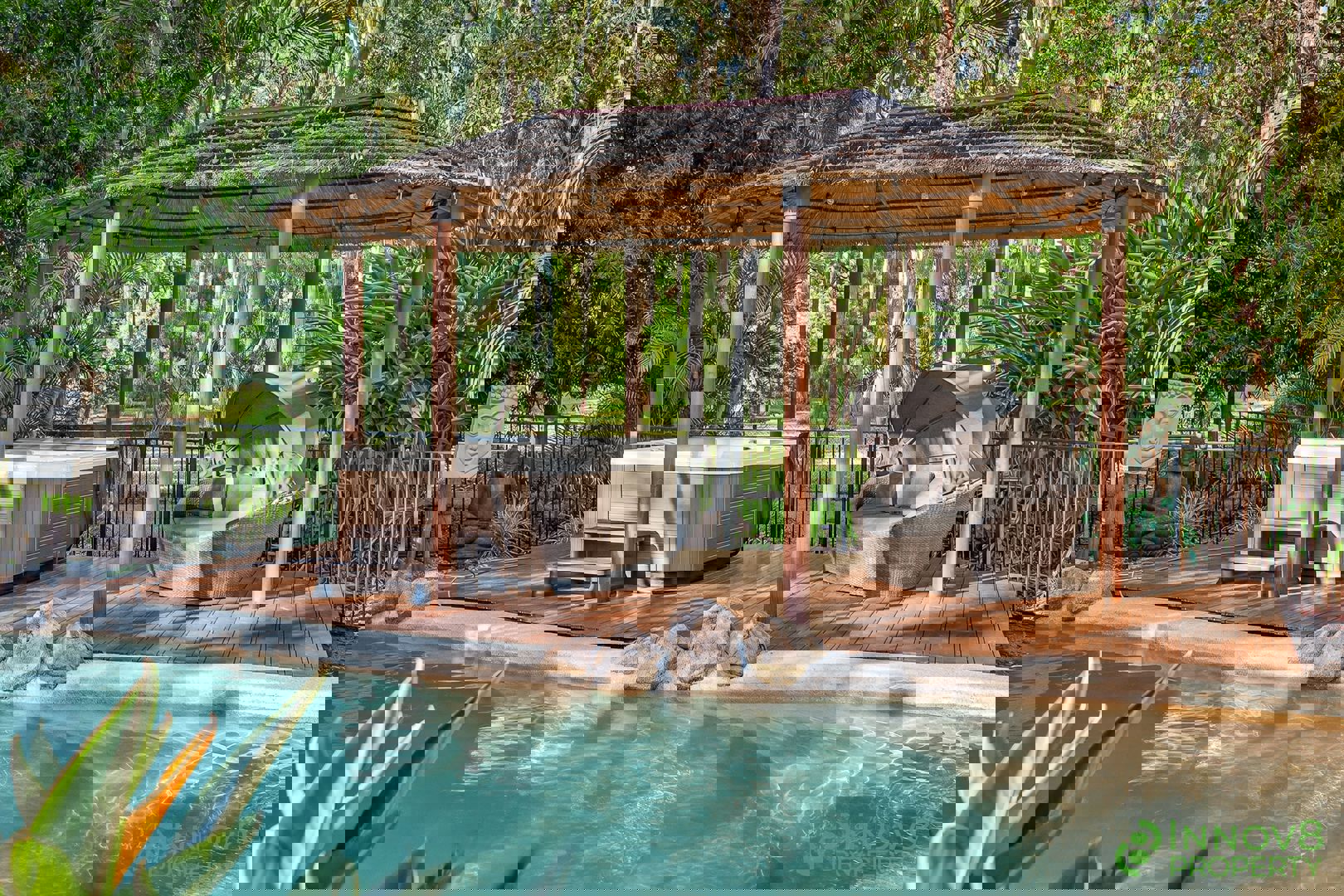 There’s also a separate gazebo with a thatched roof, timber decking, an outdoor spa, a huge day bed that’s included and gorgeous fairy lights – this area is more like a tropical resort than it is a private residence!