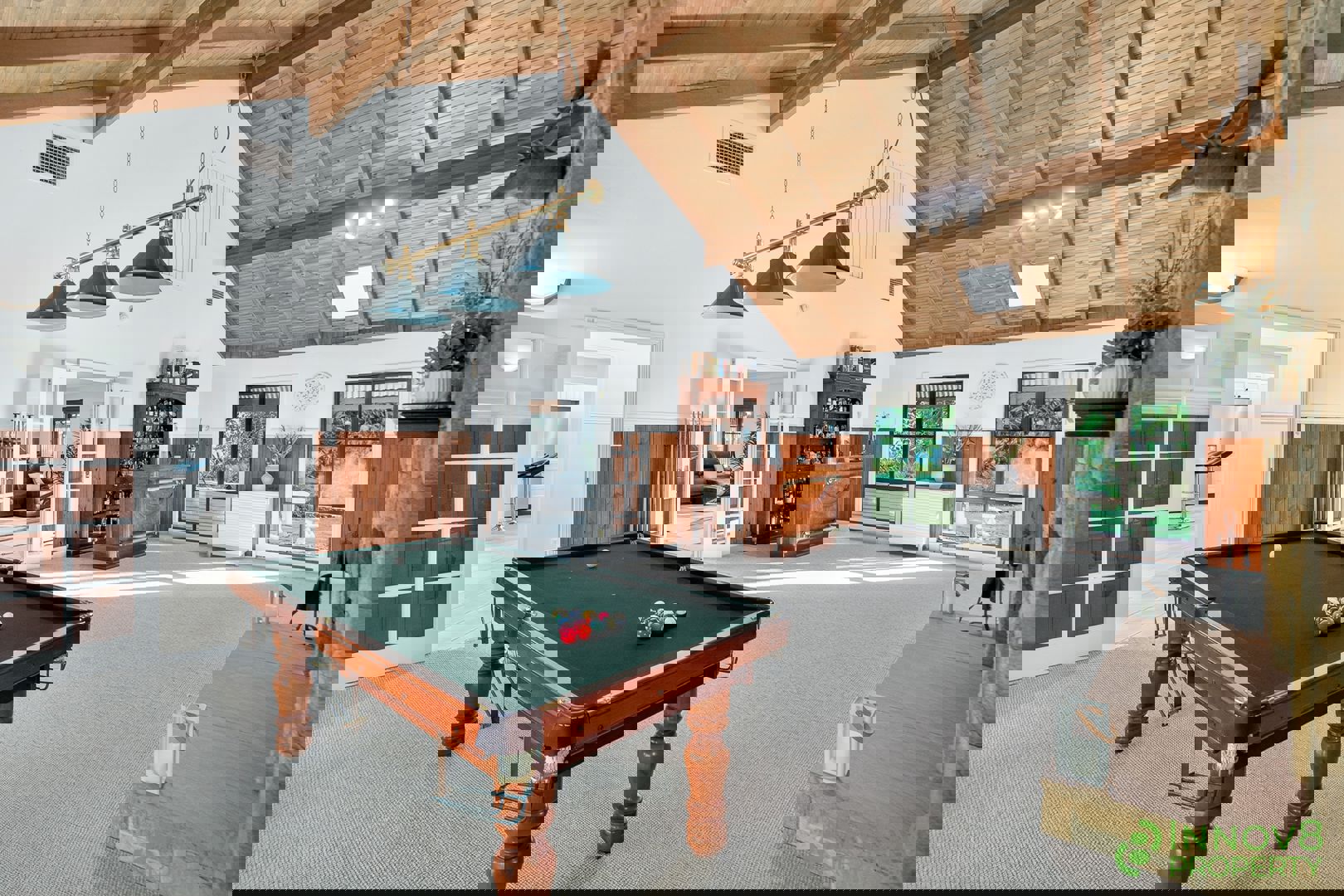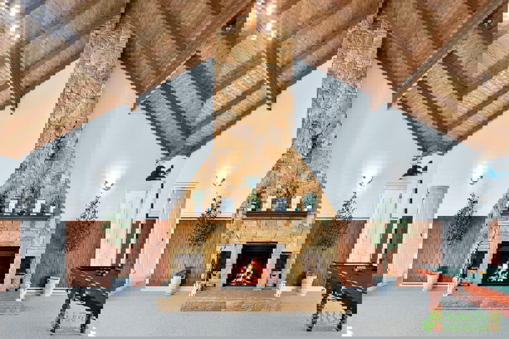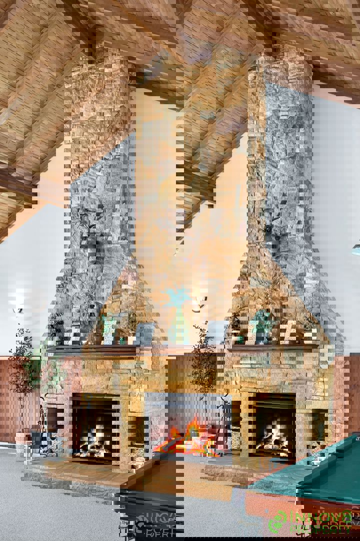• Jaw-dropping formal lounge and dining area that features a pool table (might be included if the price is right), breath-taking high vaulted ceilings with a timber in-lay and timber feature wall panelling and an astounding sandstone centrepiece with an open fireplace