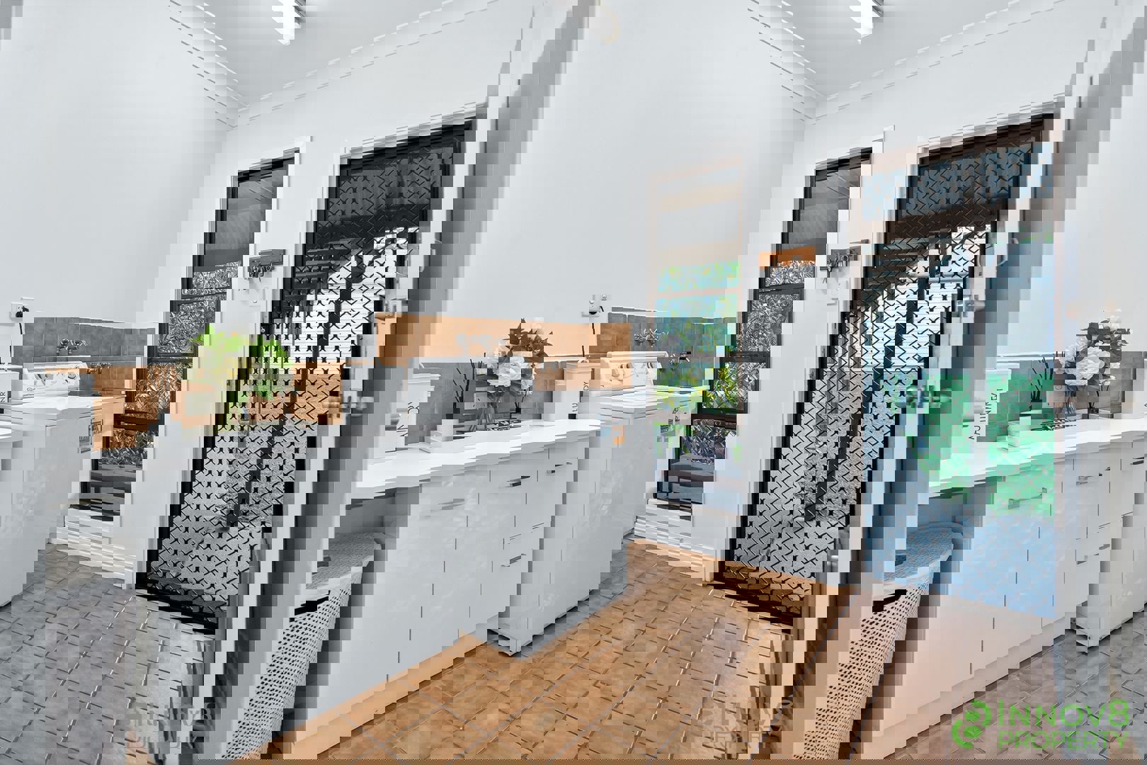 Right nearby, there’s also a separate laundry with a large bench and cupboard.