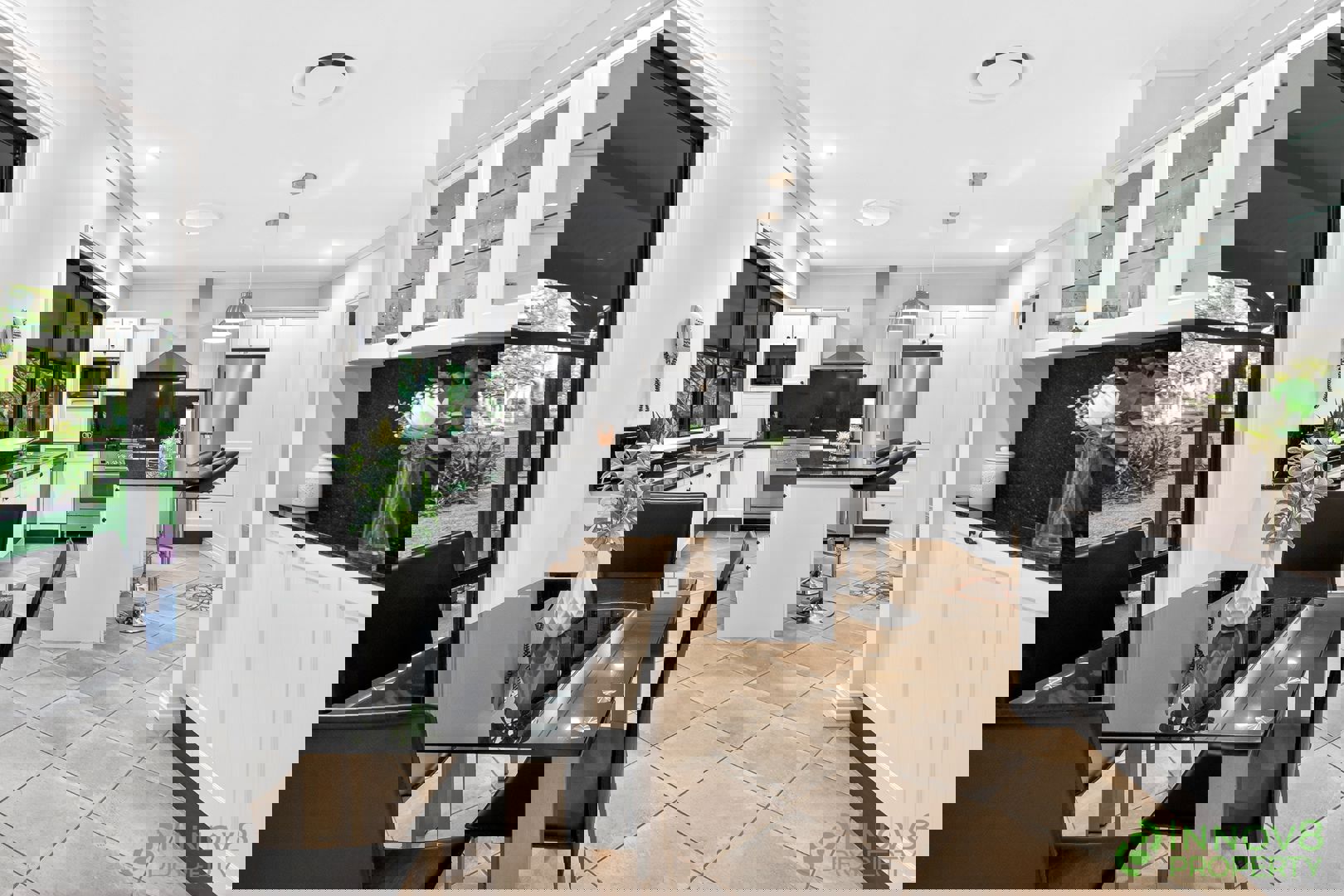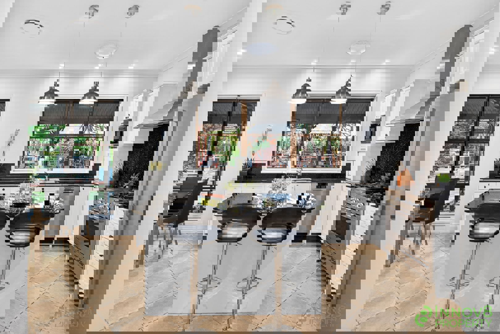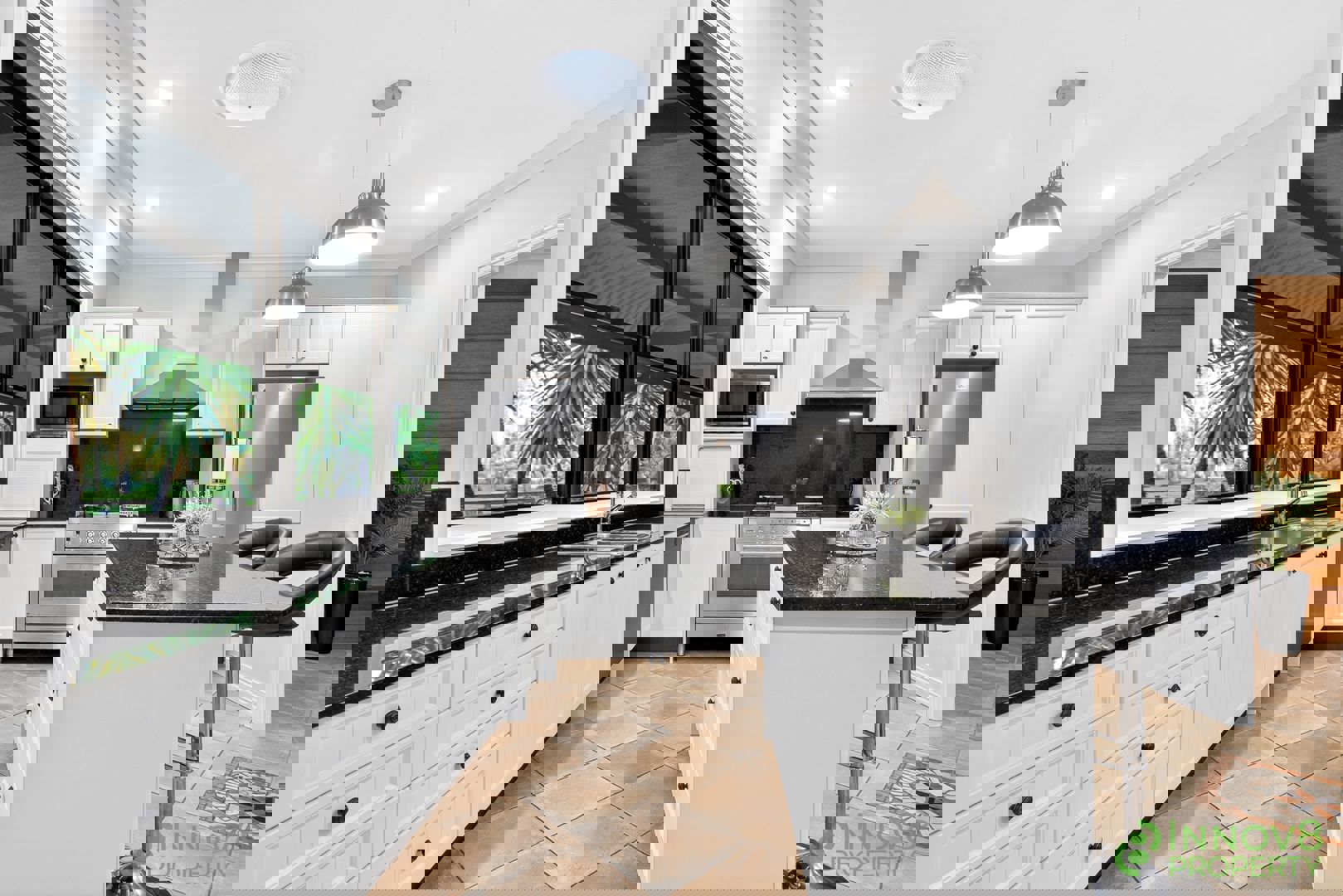 • Chef’s kitchen with huge double windows that really bring the outside in, dark granite bench tops that continue up the wall and act as a splash back, a large island bench, beautiful pendent lights, quality vinyl wrap cabinetry, two built-in pantries, a handy appliance cupboard and a carefully chosen selection of upmarket stainless steel appliances that include an ILVE 900mm oven and 5-burner gas cook top, a canopy-style range hood and a brand new dishwasher