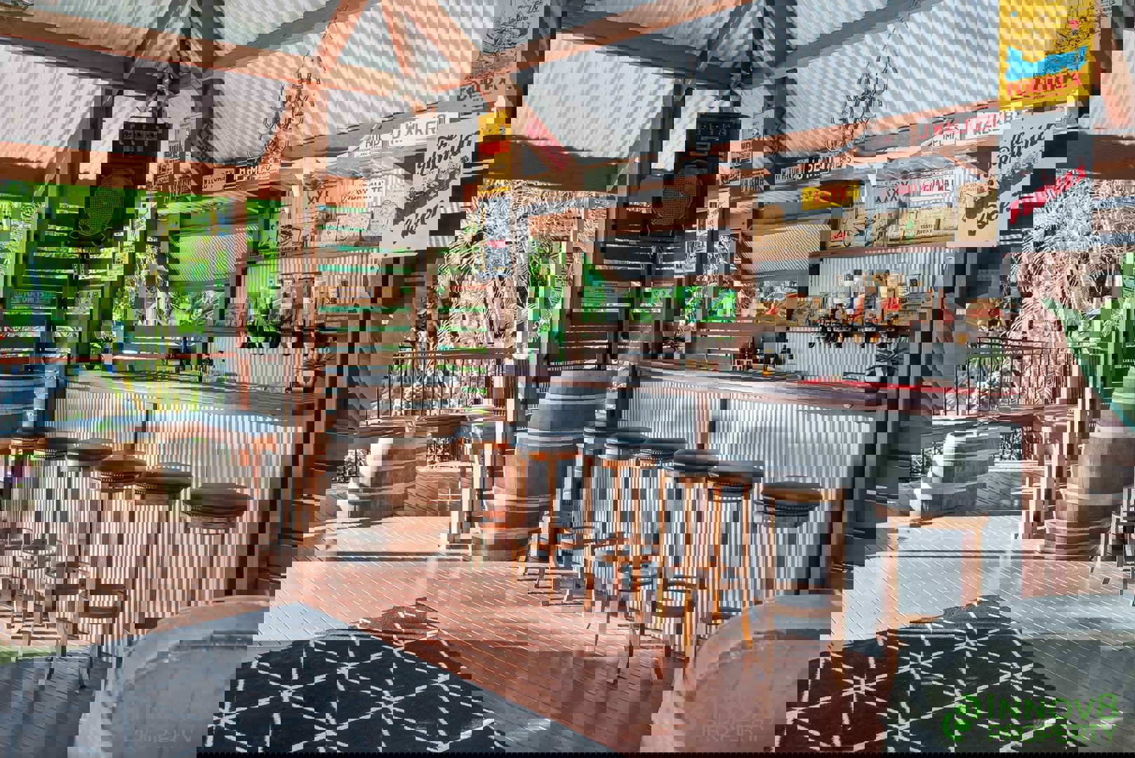 • Sensational entertainment pavilion with a flyover roof, built-in timber seating, an ornate fan and a bar area with commercial fridges…this structure is like having your own separate pub