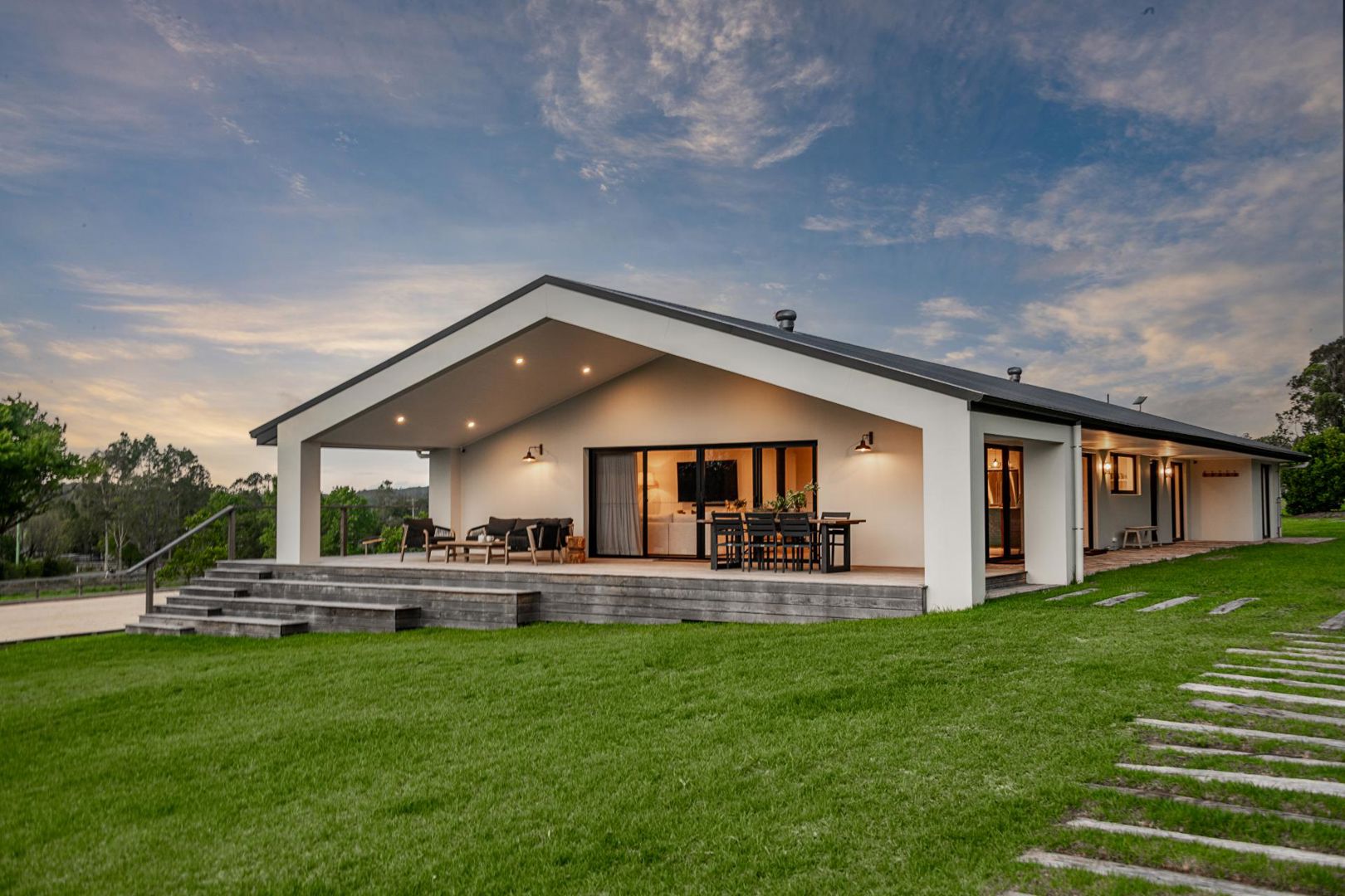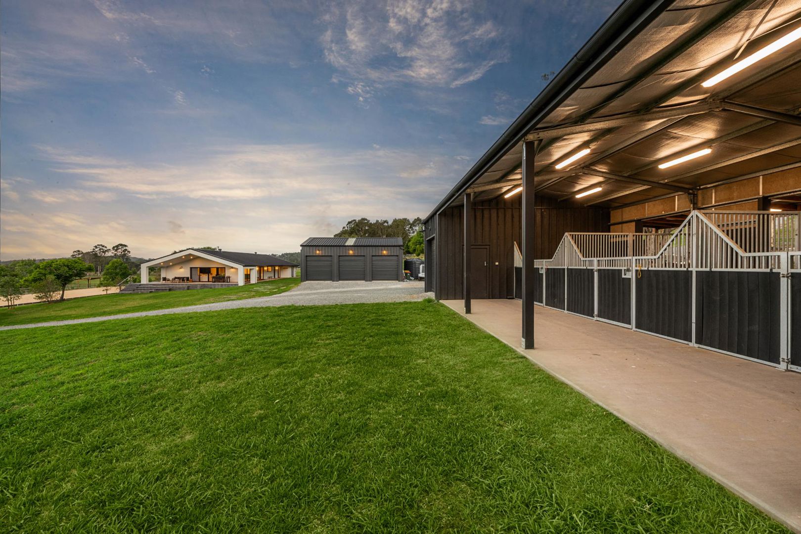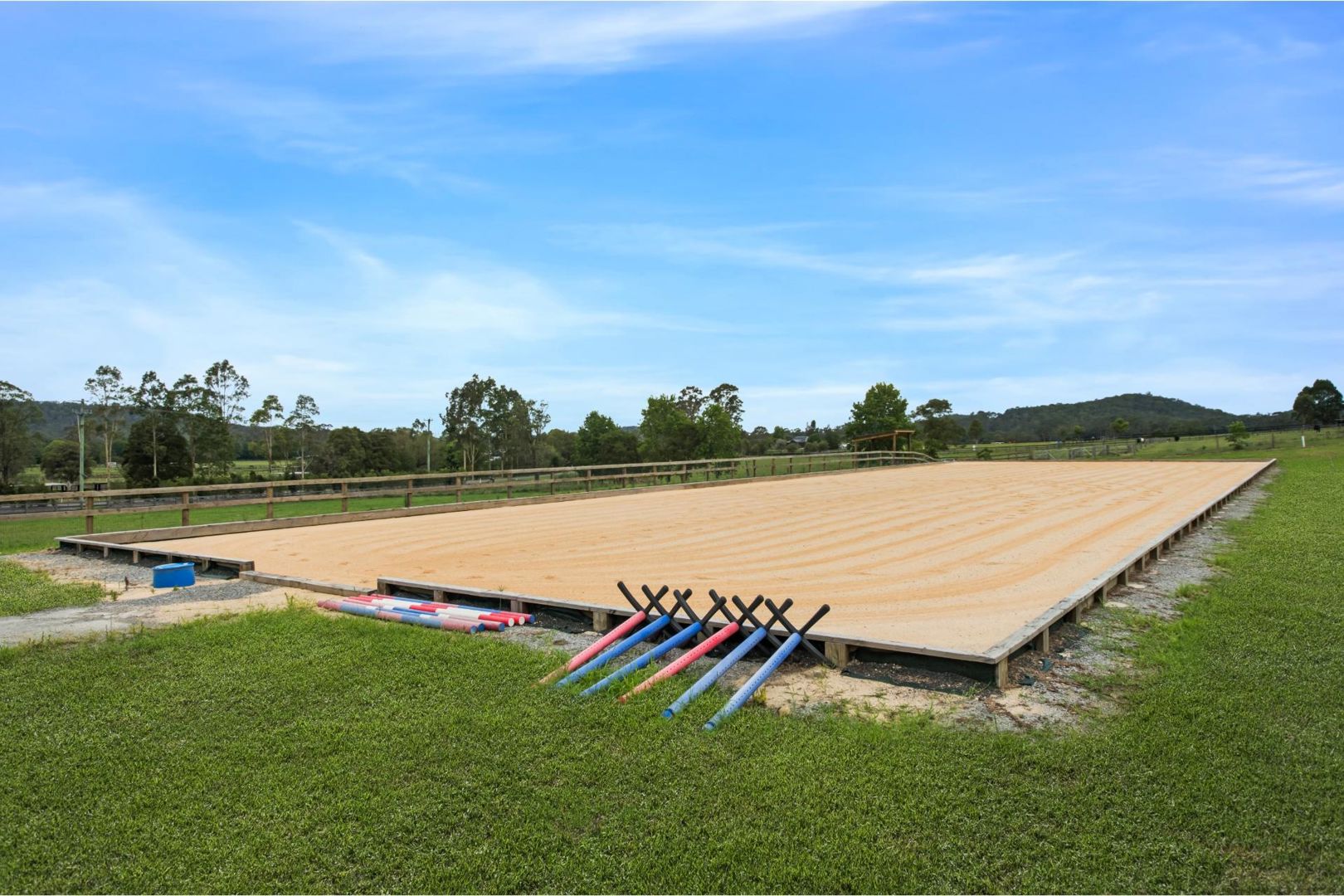 Lockable Feed & Tack shed alongside the stables. Three new stables with walkouts and access to paddock New 60x40 Dressage arena engineered and built by Arenas Australia Large flat front paddock with shelter