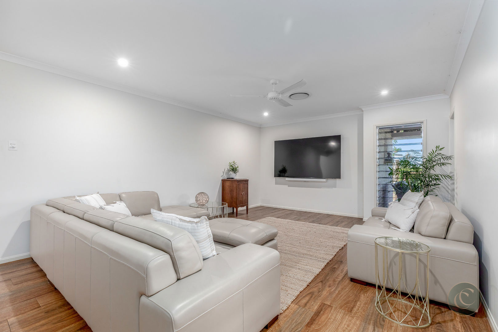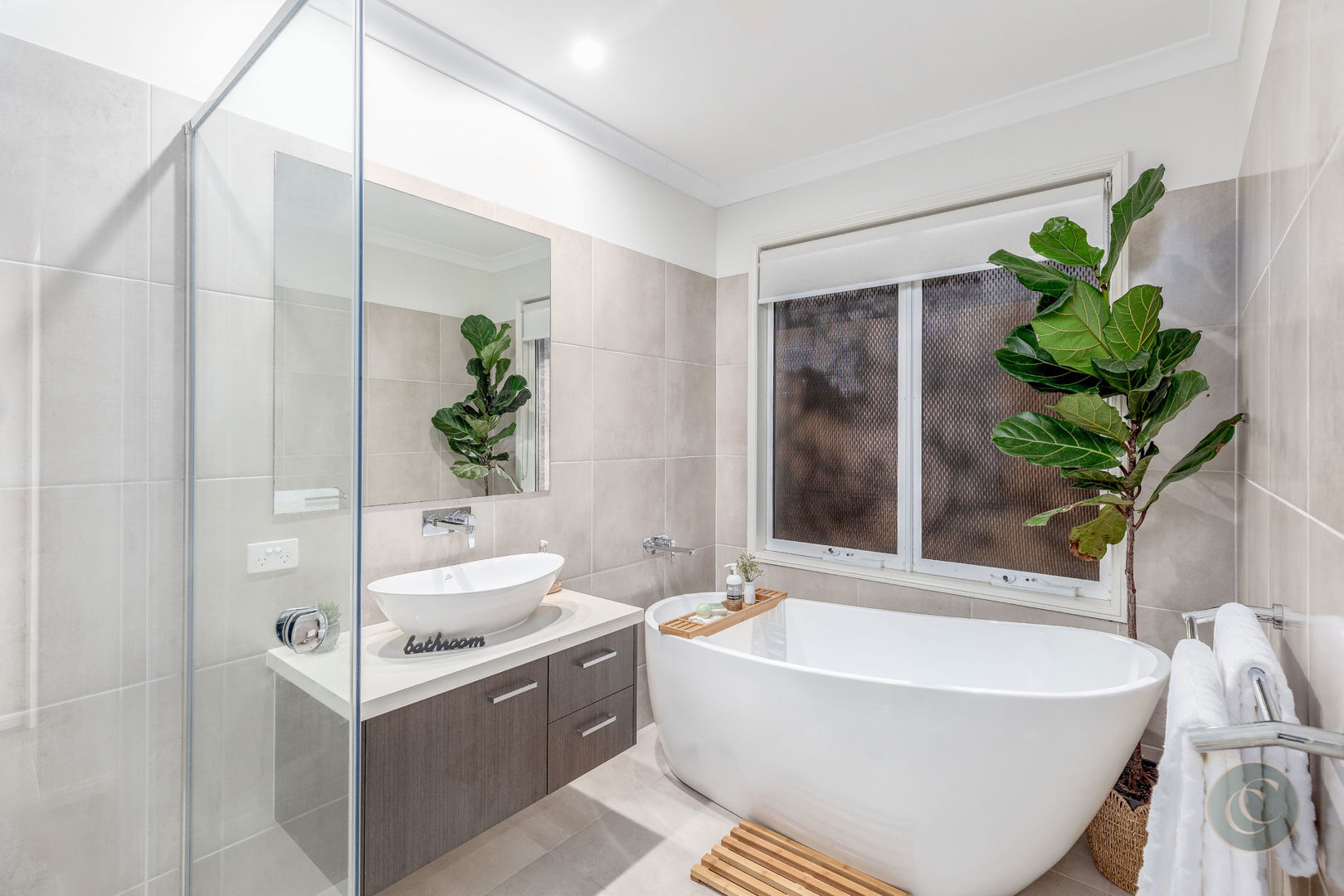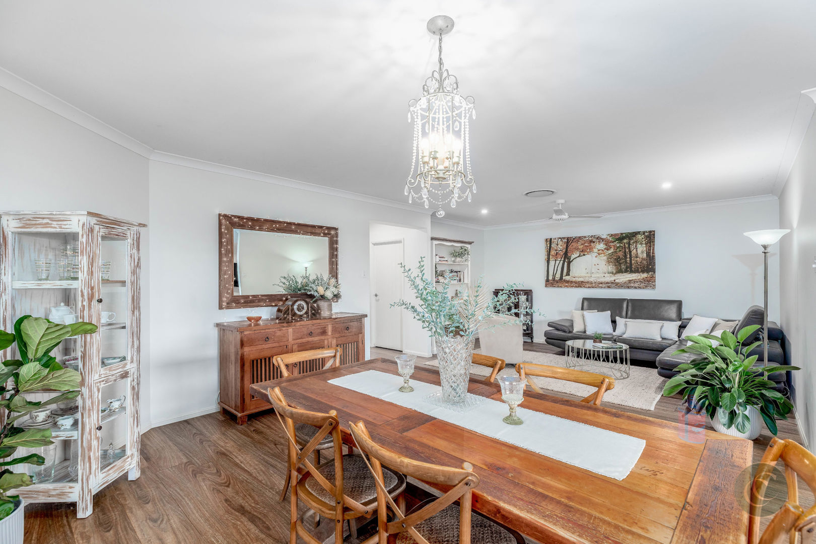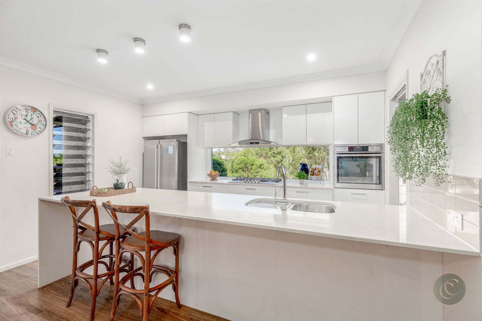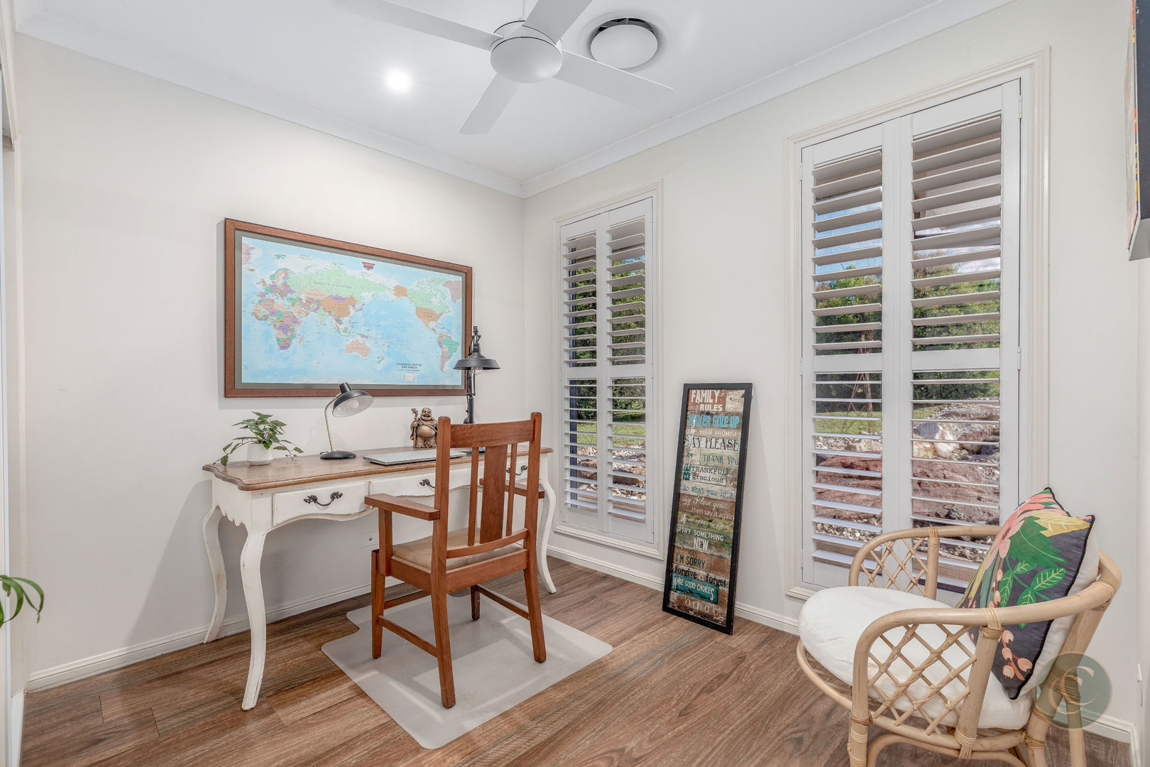The home itself showcases high quality finishes and practical design throughout. Featuring 4 bedrooms, 1 study, 2 bathrooms plus 6 car spaces this home is designed with space and usability in mind. Commercial grade vinyl planking flows through the interior, complemented by full security screening and ceiling fans in every room. Actron three phase ducted air conditioning ensures year-round comfort, while gas hot water and a gas cooktop are paired with an electric oven for modern convenience. The kitchen enjoys a stunning picture window over the sink and bench, perfectly framing views across the gardens and beyond plus a butlers pantry creating additional storage and preparation area.