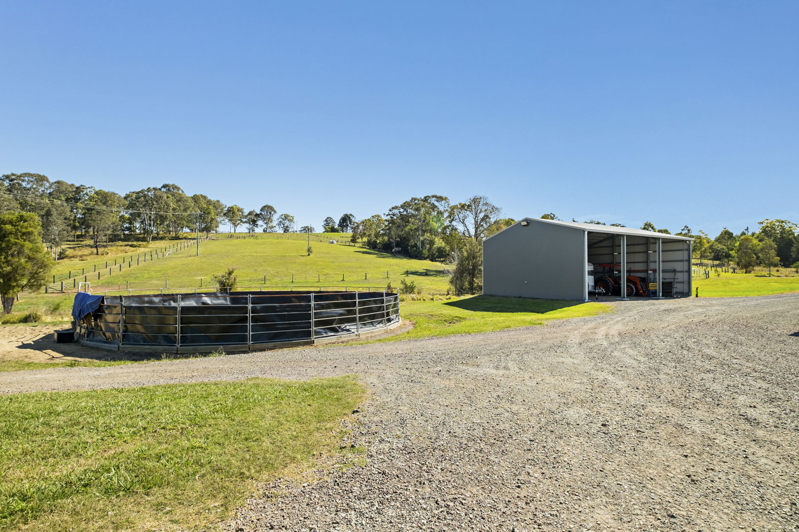 From here, laneways lead to nine electrified paddocks, thoughtfully laid out with a mix of large spelling paddocks and smaller working paddocks, each with its own automatic trough. A round yard, three-bay powered machinery shed, and two dams - one with a natural weir to maintain clarity - complete a set-up that is as practical as it is impressive. All of it can be monitored from your phone with cameras positioned over the arena and stable block.
