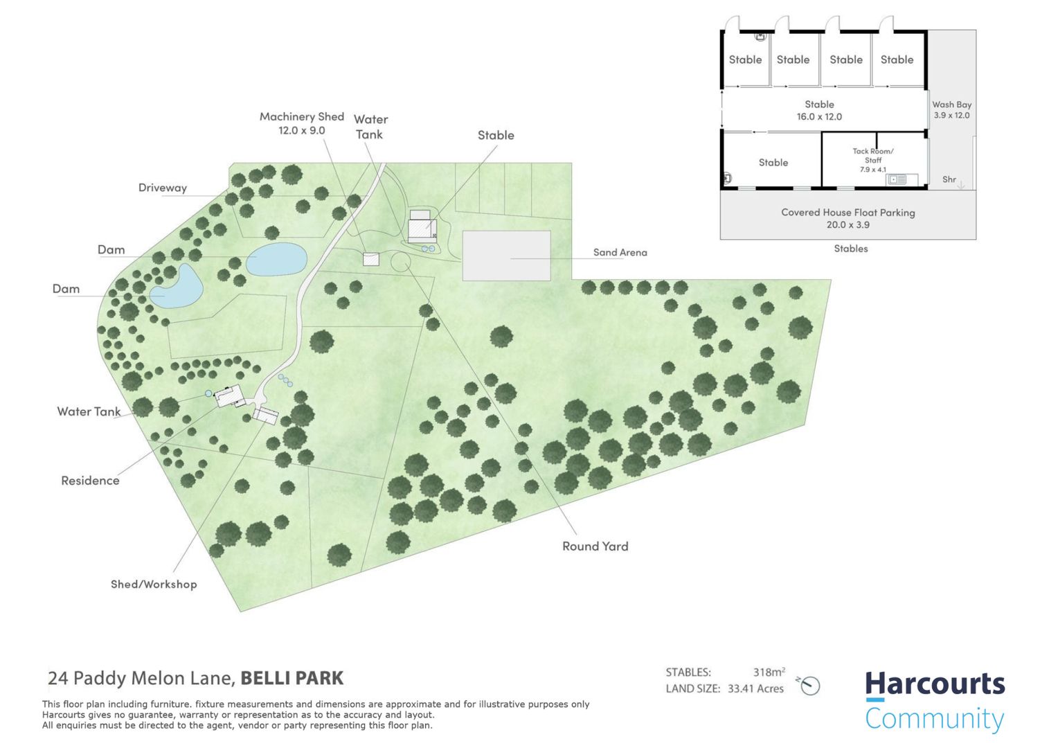 • 5 stables - 4 with yards, tack room, kitchen + undercover wash bay