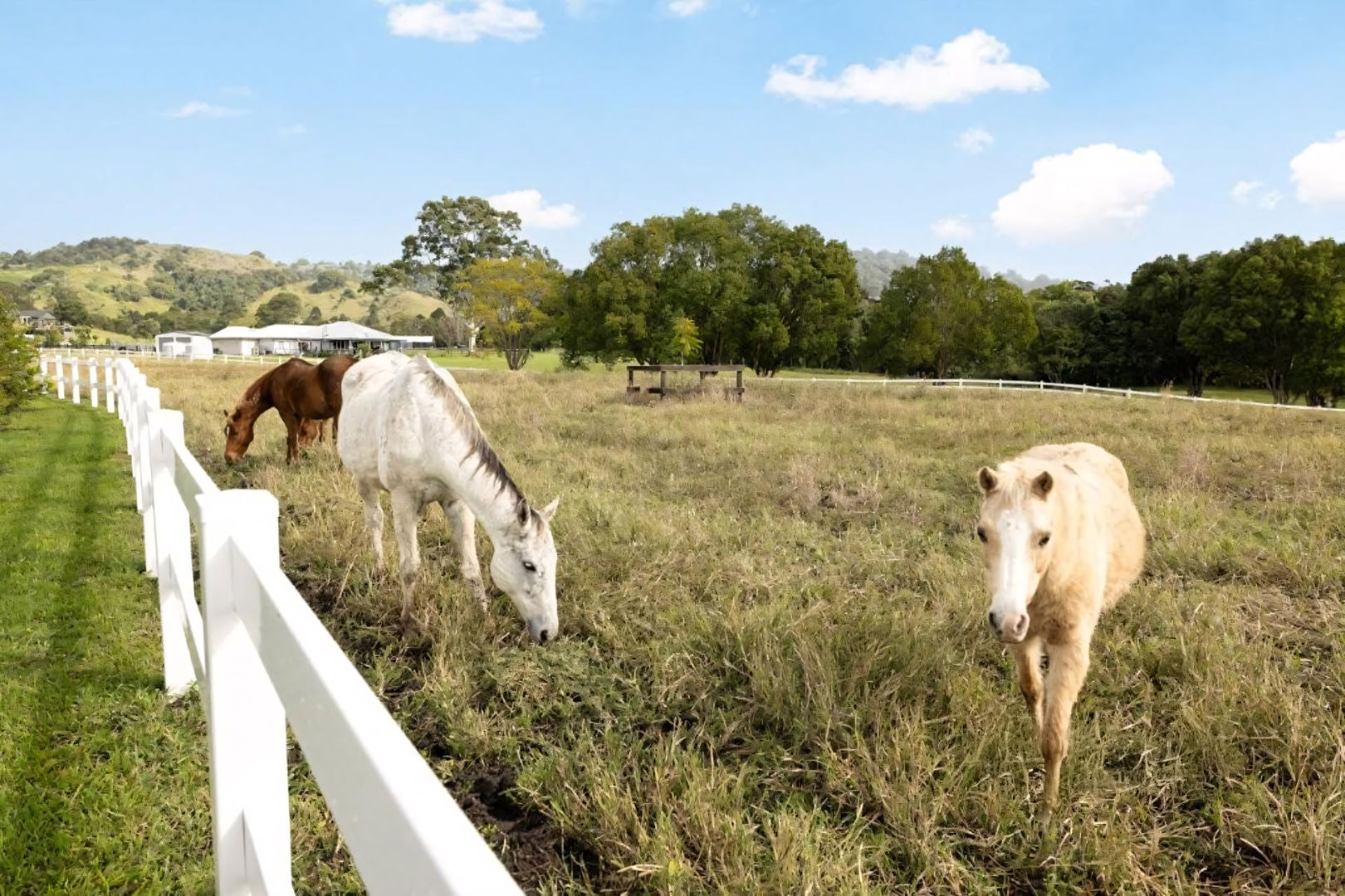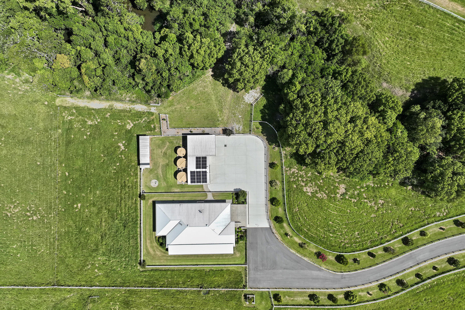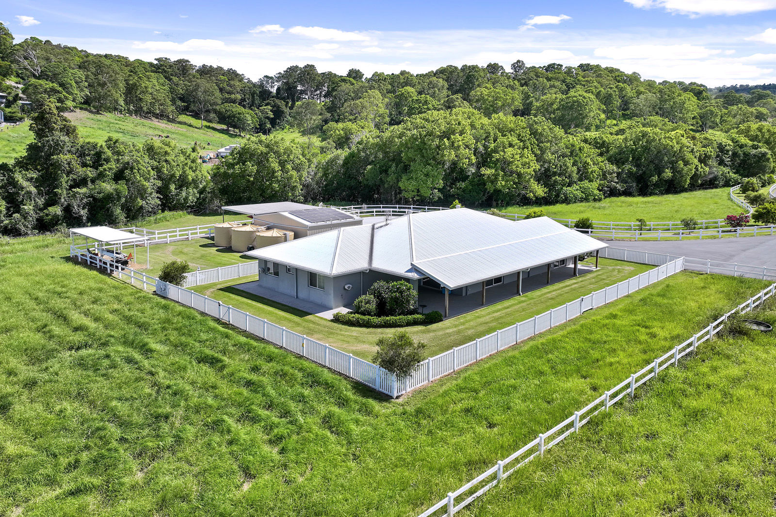 Equestrian and rural infrastructure has been carefully considered and is ready for immediate use. The approximately 14 acres of gently undulating, fully usable land is divided into nine paddocks featuring a combination of post-and-rail and electric fencing, currently set up to comfortably accommodate up to ten horses. Improved Rhodes grass pastures provide quality grazing year-round, while two spring-fed creeks offer a reliable natural water source. Supporting the land is a substantial shed for all the toys with water, shelving, remote-access doors and a mezzanine level, complemented by an adjoining open shed ideal for tractors, horse floats or additional machinery.