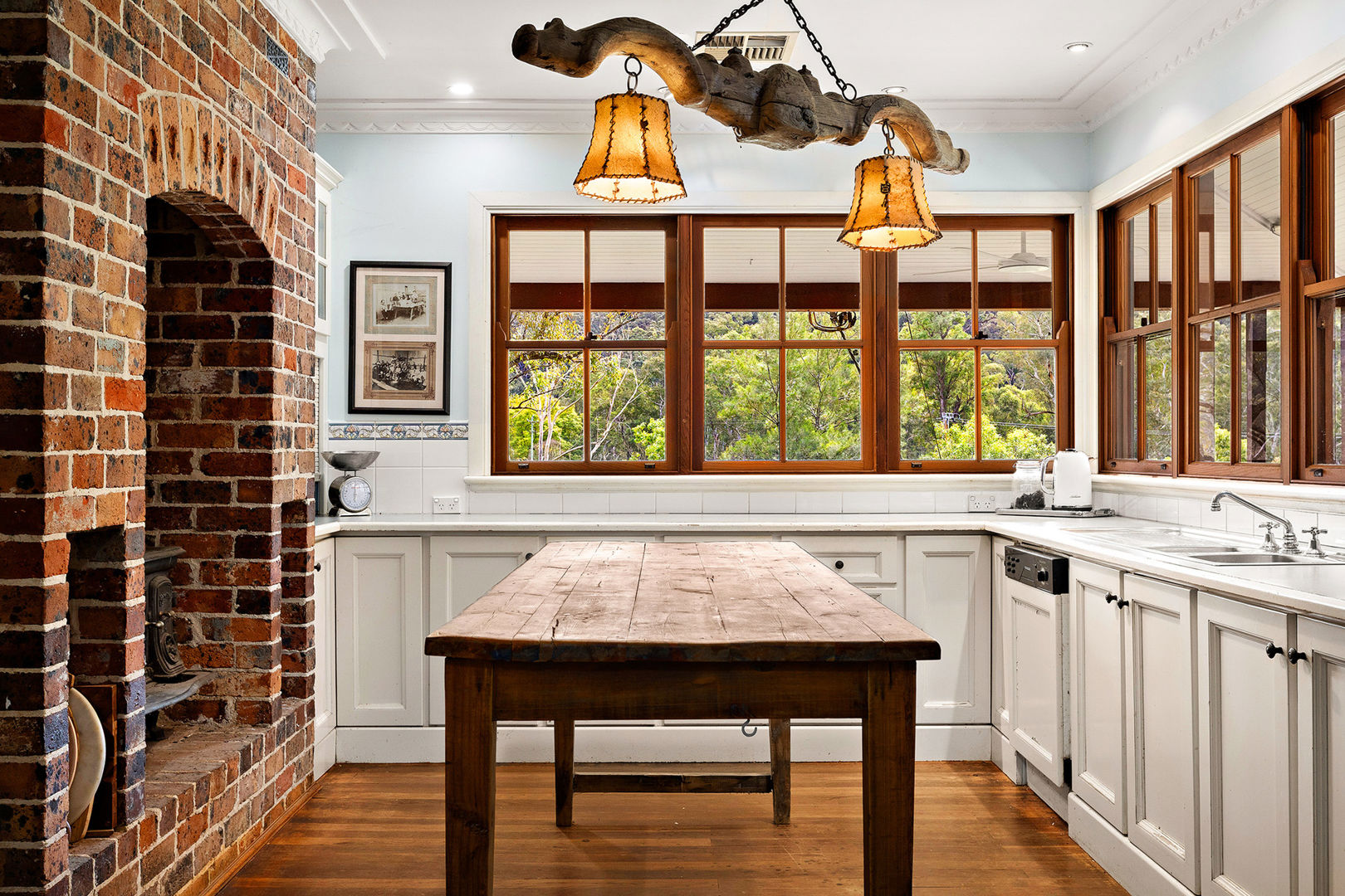 • Country kitchen with wood fire oven, breakfast bar, and windows framing valley views. Cosy lounge and dining areas with a fireplace, creating warmth and charm.