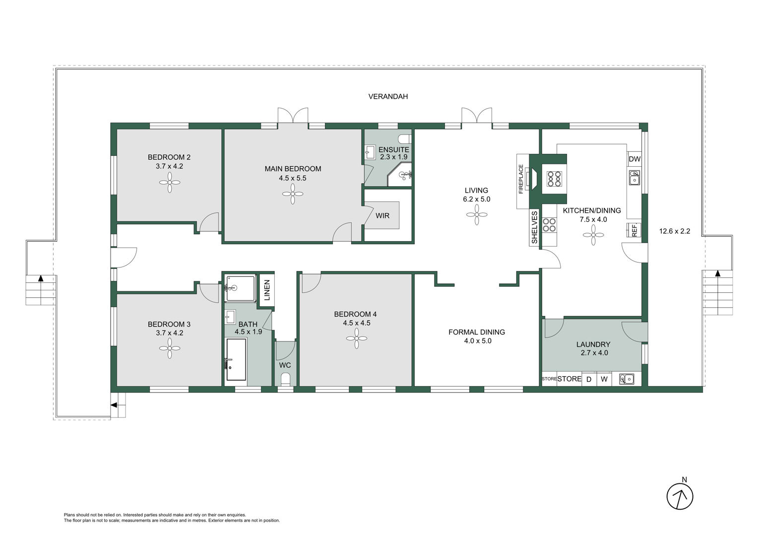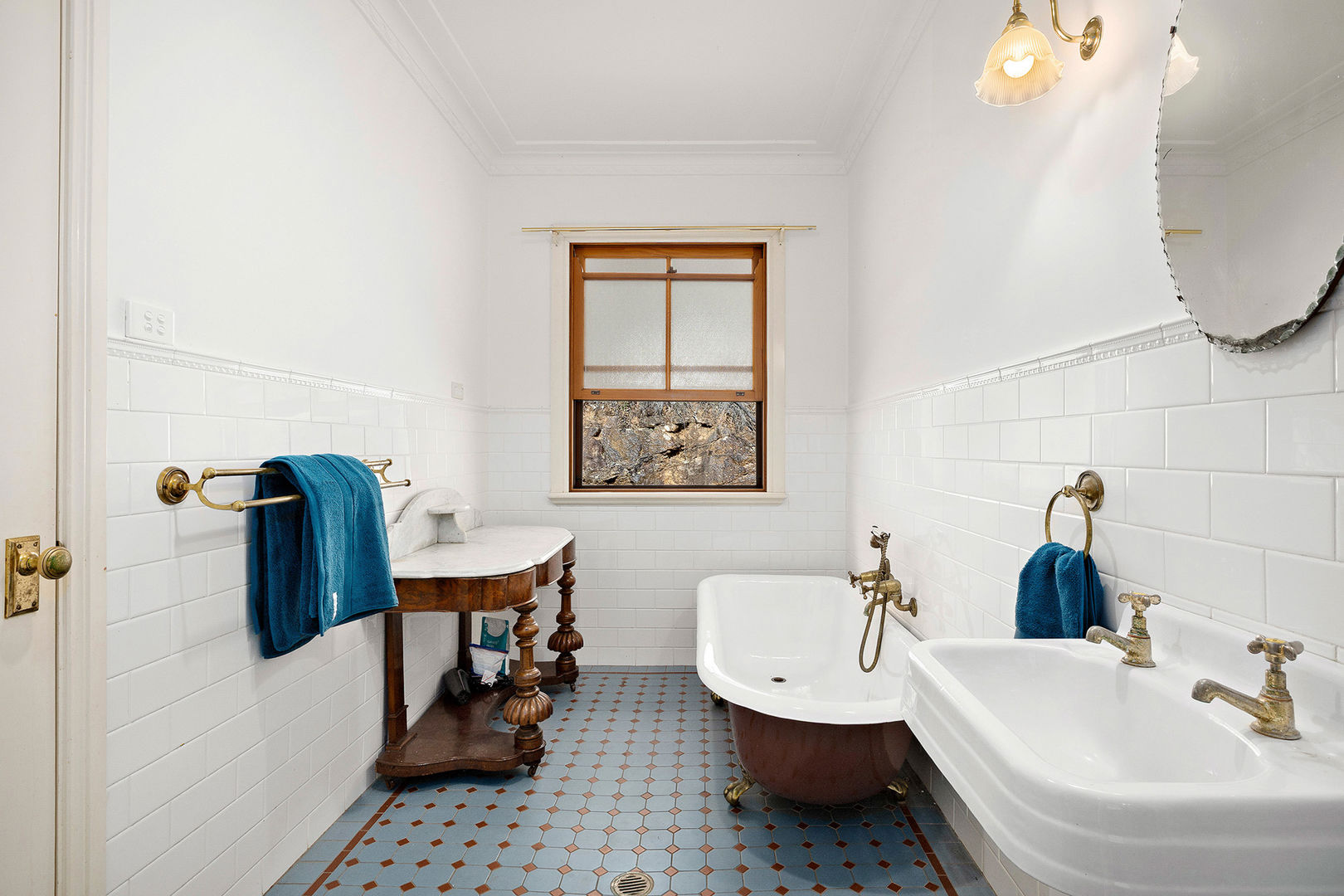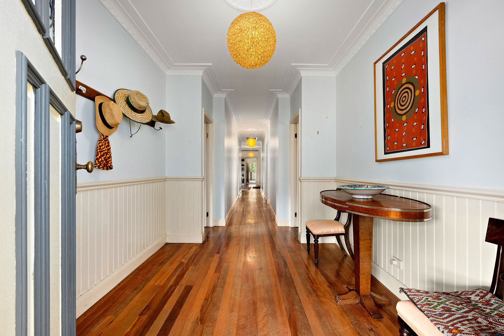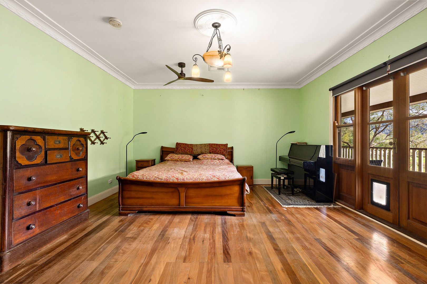 • Four bedrooms, master with walk-in robe, ensuite, and French doors to verandah. Other three bedrooms are spacious with ceiling fans, while the main bathroom offers character detail and a freestanding tub.