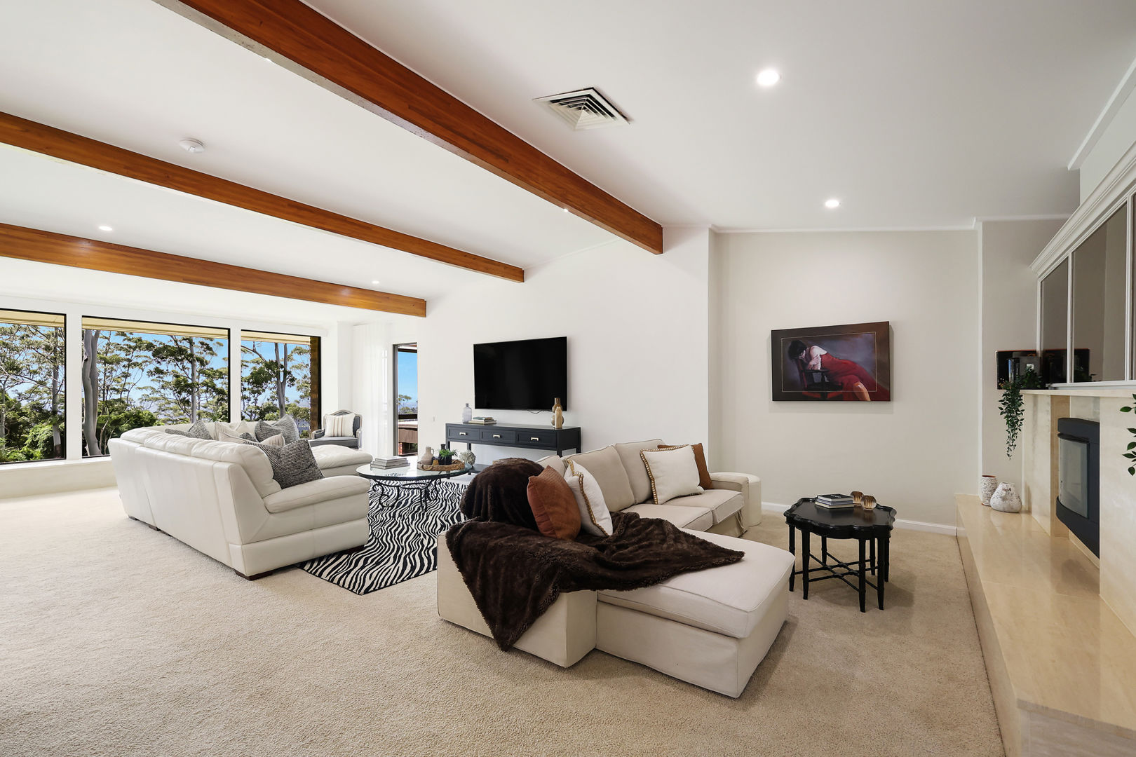 - Expansive, light-filled lounge enjoys a lush outlook, enhanced with exposed timber beam ceiling and stunning stone pillars