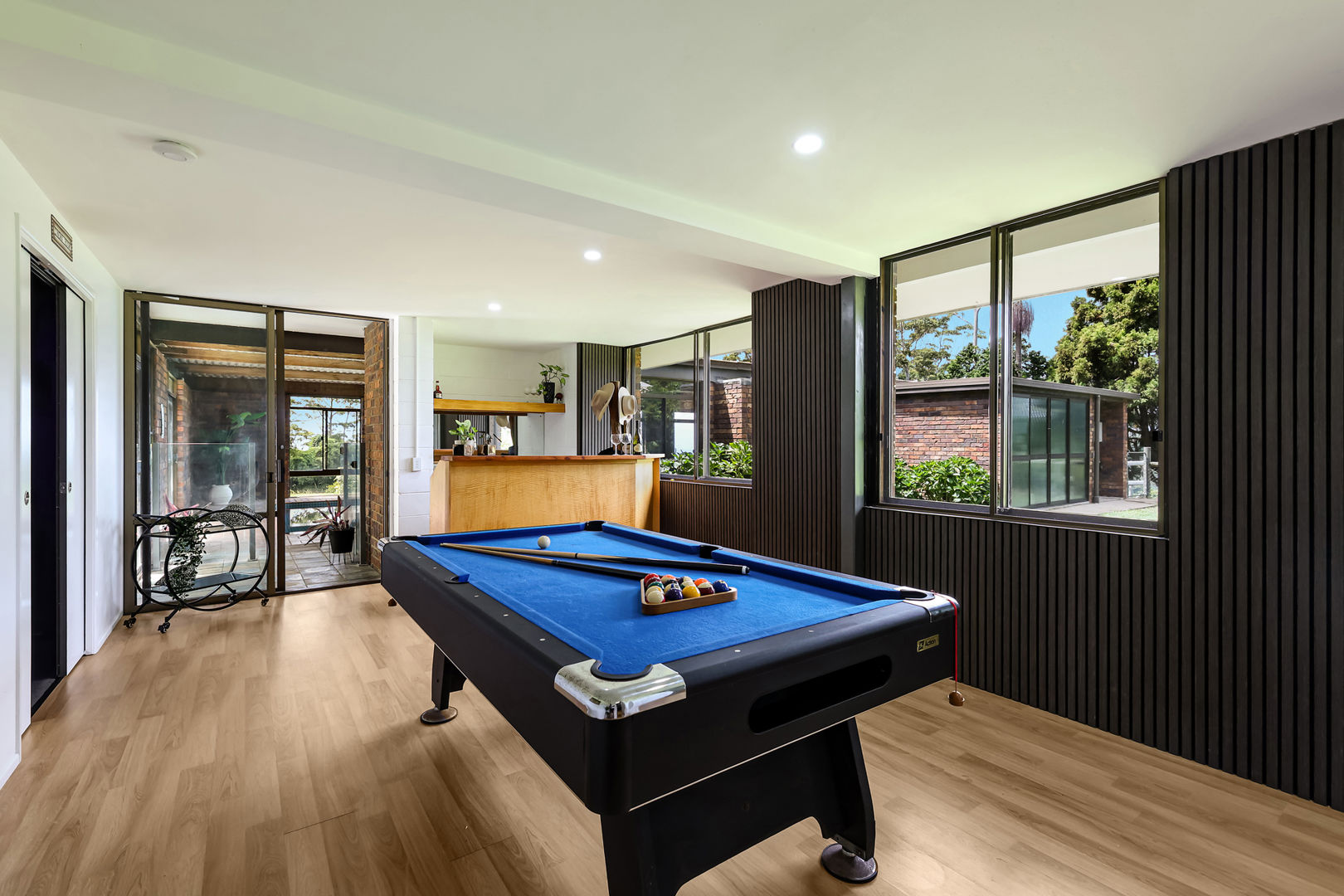 - Games room with feature timber wall panelling and wet bar