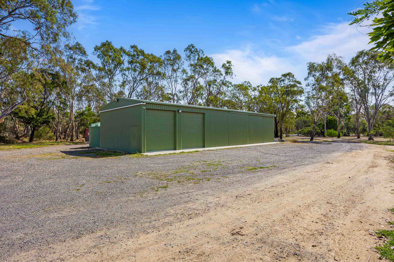 • Large Colorbond shed (approx. 23m x 7.5m) featuring 6 bays, including 2 clear-span bays with a large double sliding door, 2 roller doors (1 remote), and concrete floor (125mm thick). Bay 1 is set up for a hoist, complemented by 15-amp power points and LED high bay lighting. Two 30,000-litre water tanks are connected.
