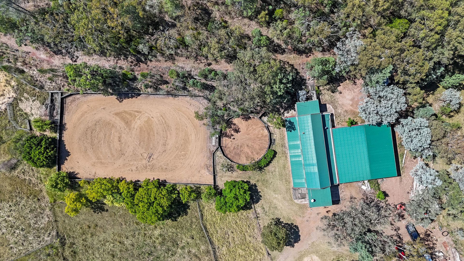 One 50m x 26m fully fenced (cattle rail and heavy duty rubber), cow working or horse sand arena