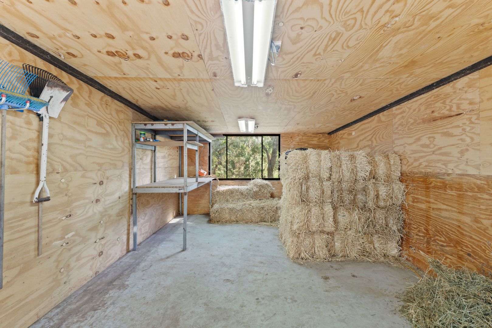 Fully timber lined tack Room, 4m x 4m,with concrete floor, and water and power connected.