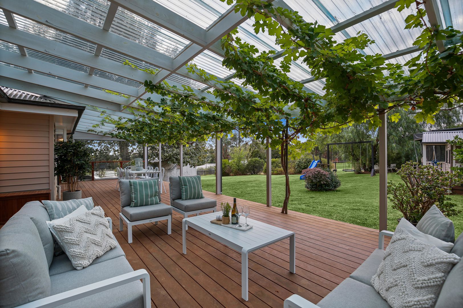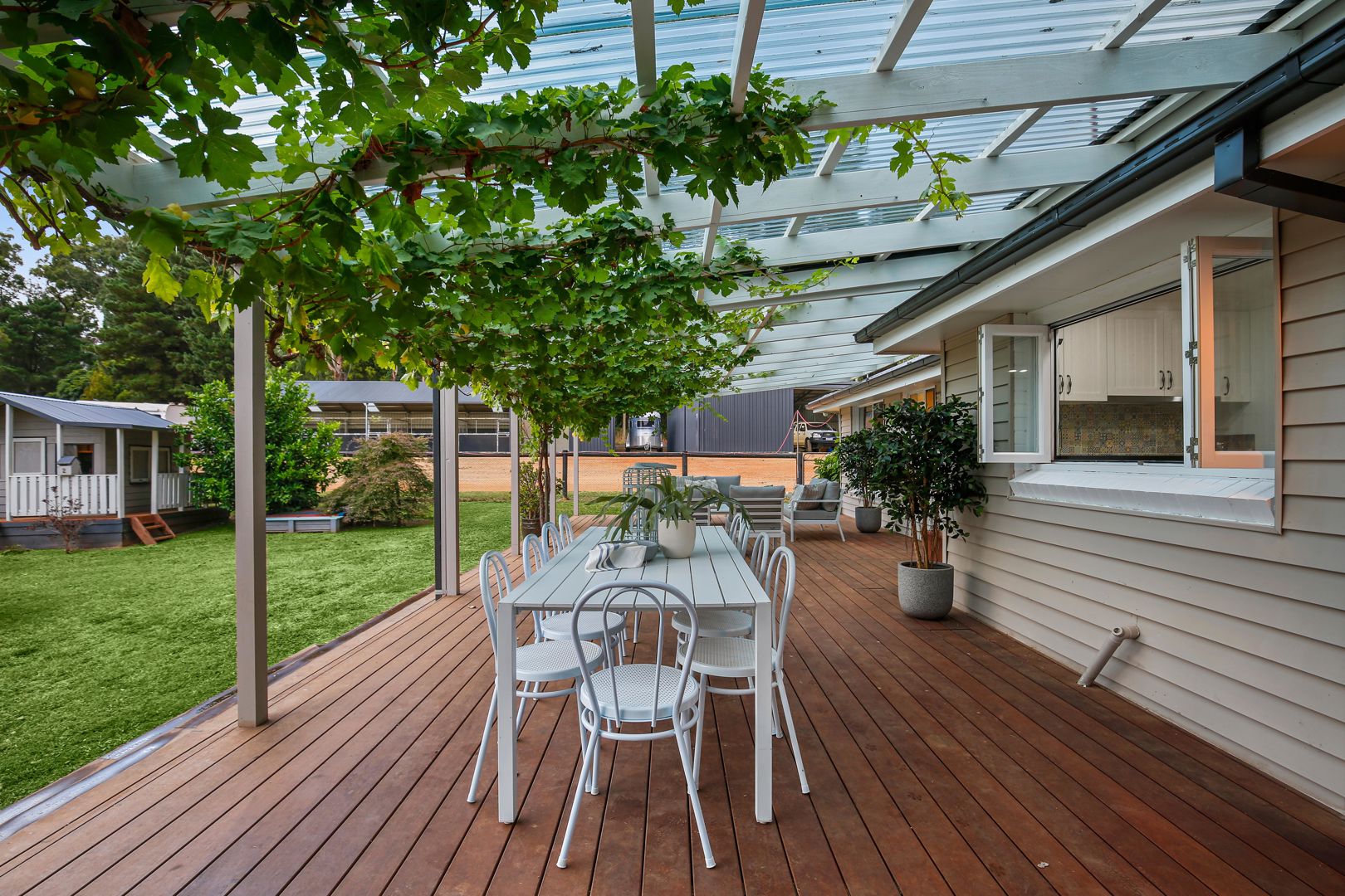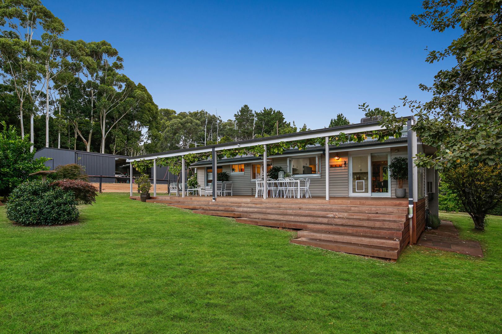 A refined renovation graces the family home, welcoming, relaxed, and light-filled, with northerly outlooks across the land. Blending country charm with modern finishes, it features timber floors, a wood fire, ducted heating, and evaporative cooling. A vine-wrapped entertaining deck extends the living space outdoors to the open lawn—perfect for play and bringing everyone together. Topped in sparkling stone, the elegant kitchen hosts a freestanding 900mm stove, dishwasher, patterned tiled splashbacks, and a walk-in pantry. Three bedrooms atop plush carpet share a bathroom styled with floor-to-ceiling tiles, a floating vanity, and a shower over bath, plus a second toilet and a laundry.