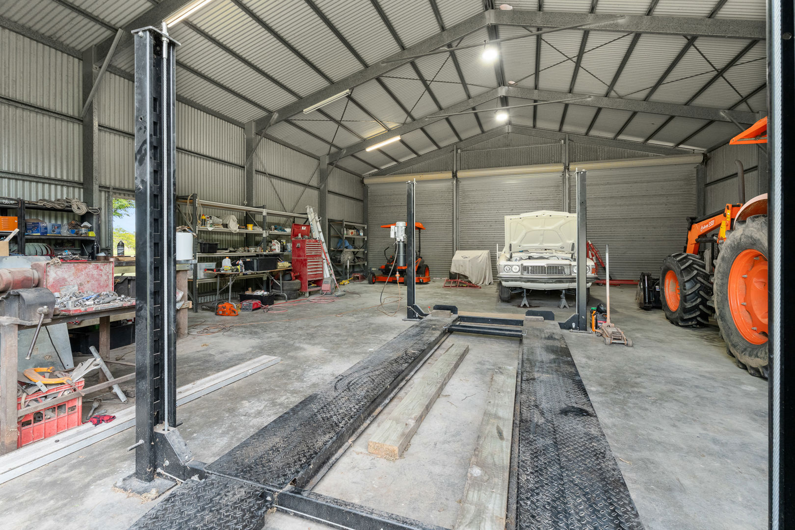 • 15m x 12m shed with high clearance, 4-post hoist, power, lighting & shelving