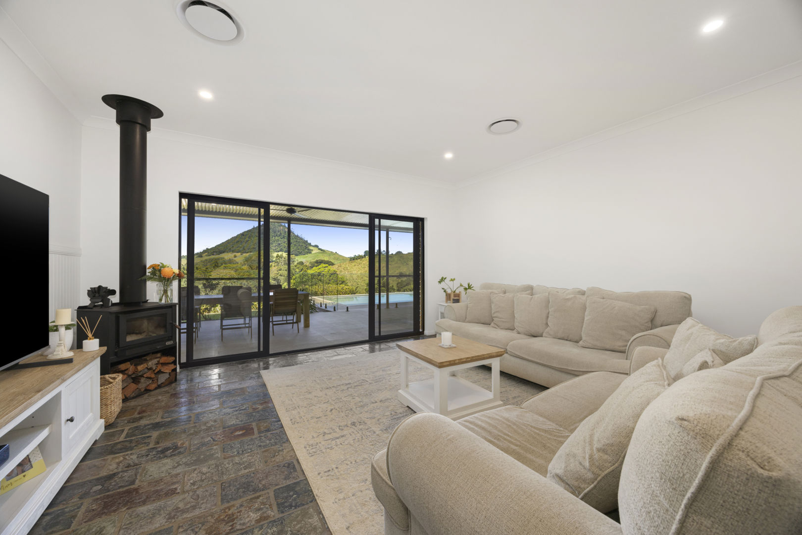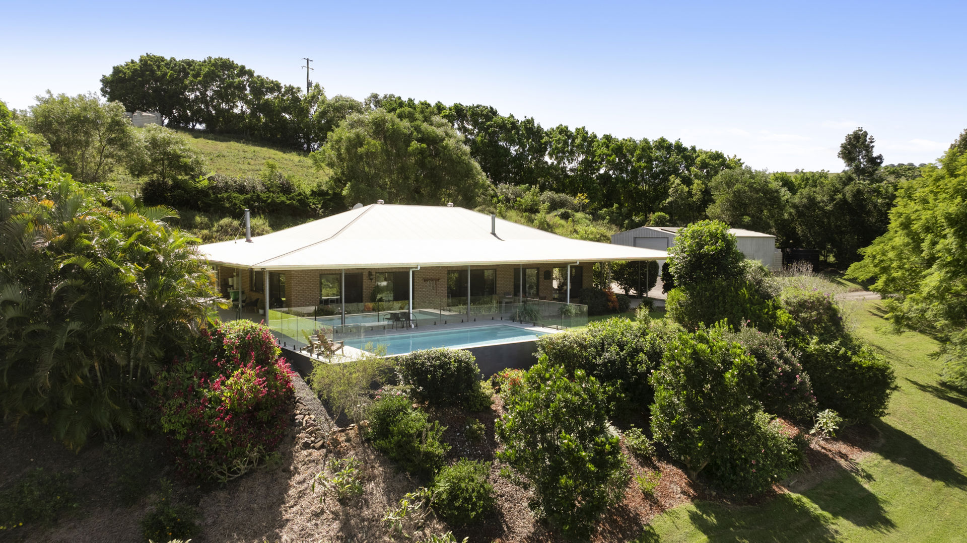 The outlook is a standout feature, with uninterrupted views to Mount Pinbarren and a sense of stillness that defines the lifestyle. A heated saltwater pool and covered alfresco area overlook the land, creating a private vantage point across your acreage.
