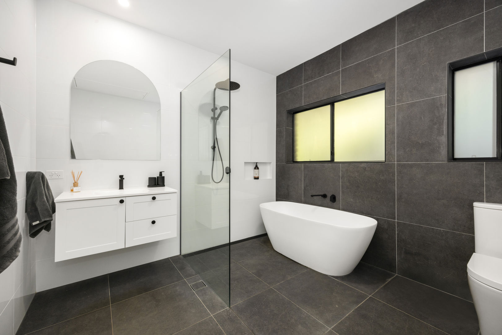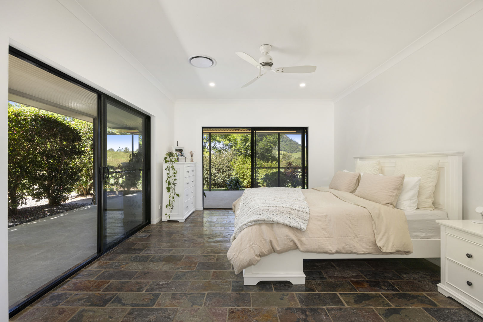 Both bathrooms are finished to a high standard with floor-to-ceiling tiles, oversized dual-head showers, and a freestanding bath in the main. Comfort is assured year-round with a brand-new Fujitsu ducted, zone-controlled system, while a wood-burning fireplace adds atmosphere in the cooler months.