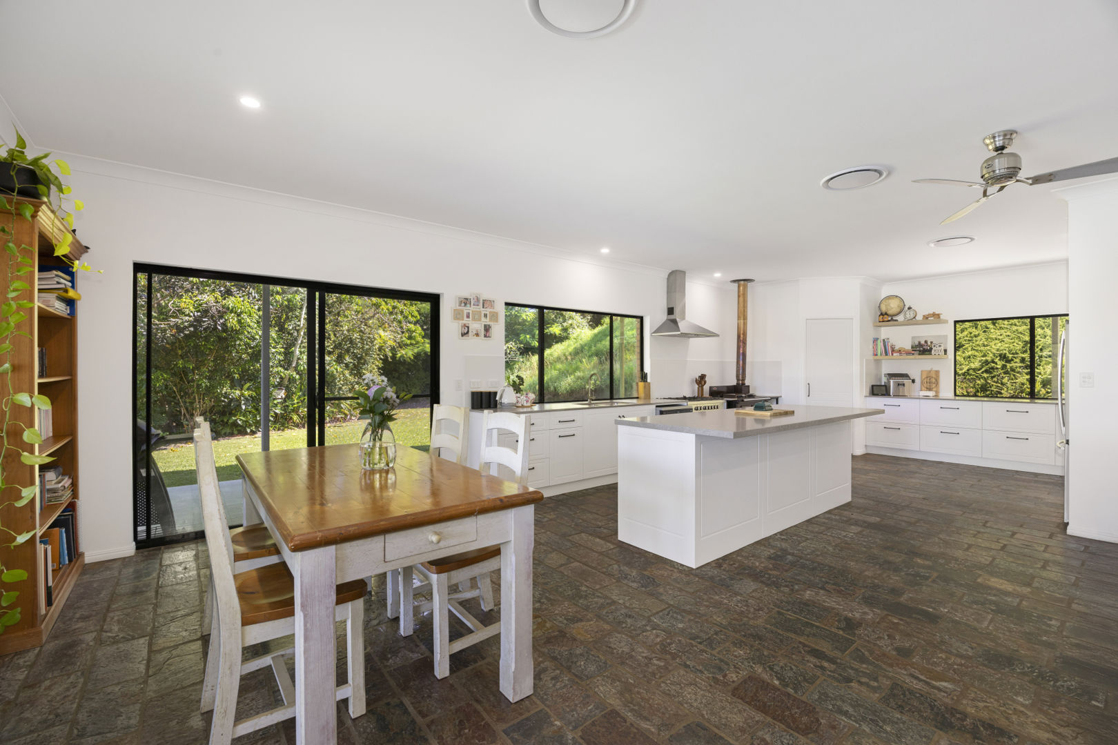Low-set and sprawling, the home offers four bedrooms, two bathrooms, open-plan living and dining, plus a separate lounge for true family flexibility. Indian slate flooring and a VJ half-wall feature bring warmth and character, while 2.7m ceilings and natural light keep the space feeling open and relaxed.