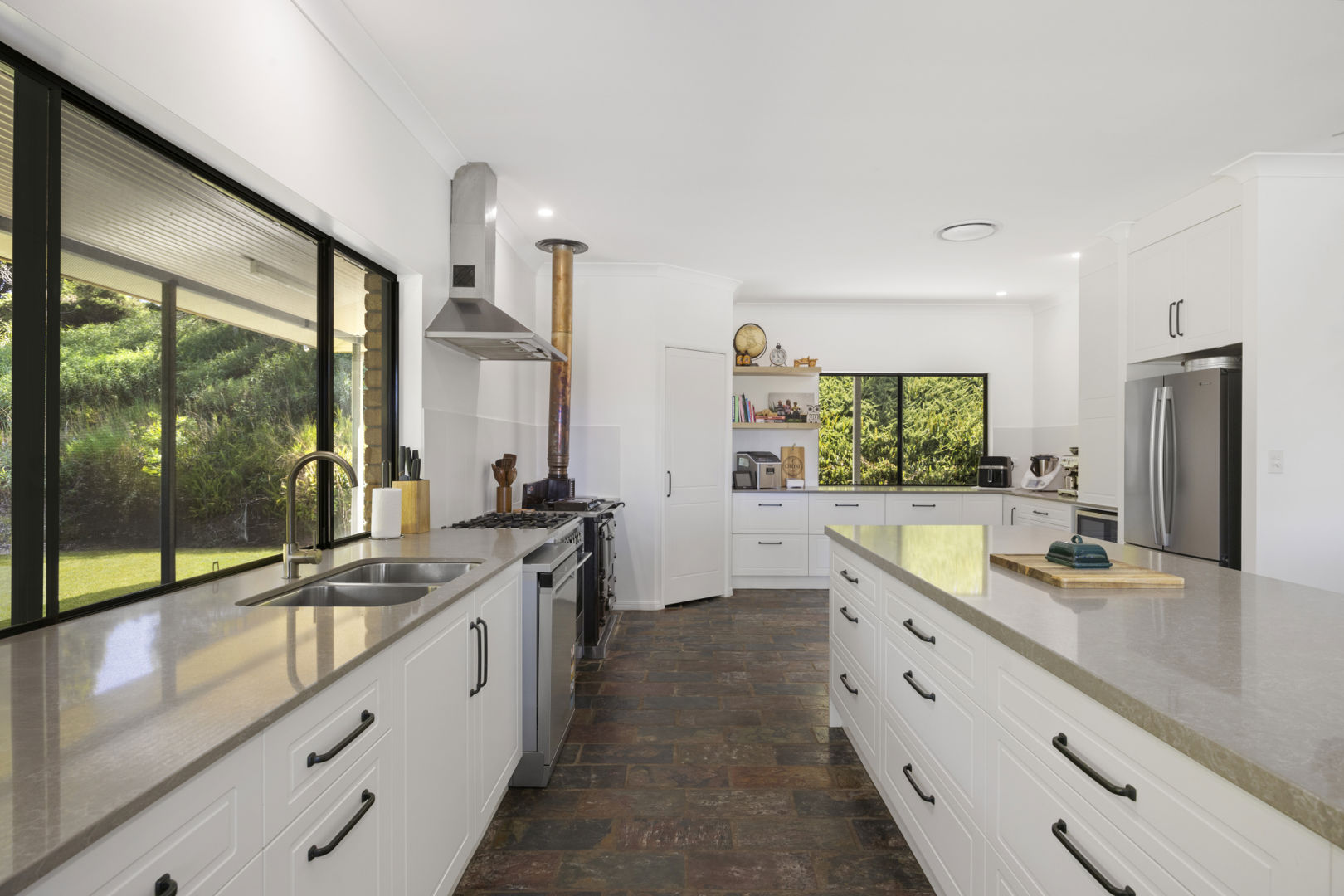 The kitchen has been thoughtfully renovated for real life. A 40mm stone island bench anchors the space, complemented by a 900mm Fisher & Paykel gas cooktop and oven, a functioning Rayburn oven, walk-in pantry, and multiple work zones, ideal for entertaining or everyday living.