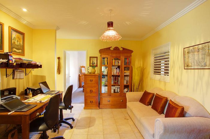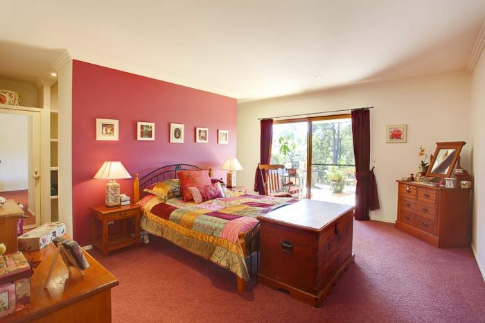 To the right of the foyer is the open plan office which creating an option of using it as an extra bedroom. You also find another three bedrooms and the main bathroom which includes both a shower and bath. All bedrooms have built-in robes and two have TV’s mounted on the wall. The blue bedroom is completed with a door to the side verandah and paddocks as well as a CT monitor to the stables.