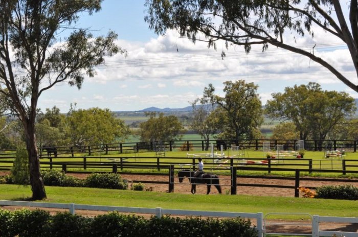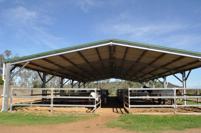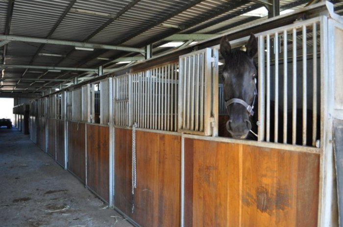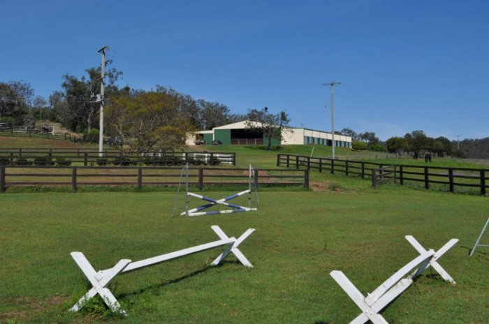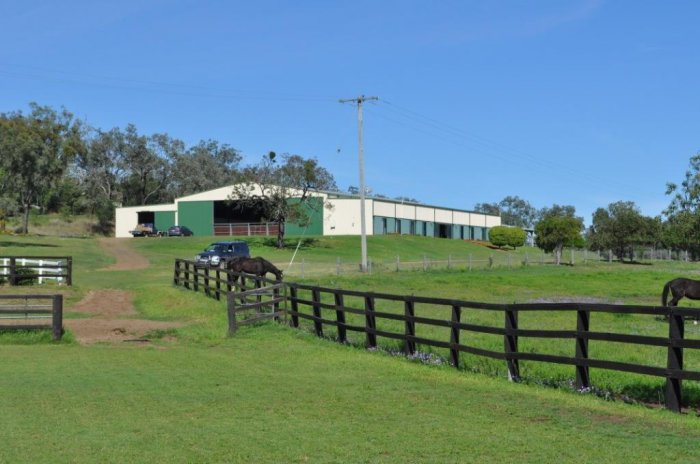 42 mtr x 22 mtr indoor arena, 10 stables, indoor wash-bay, 1 double bedroom, 3 single bedrooms, kitchen and dining area. Undercover yard complex with 10 6 mtr x 6 mtr steel yards adjoining indoor arena. 41 mtr x 6 mtr building divided into 9 stables, wash-bay, tack room and vet/lab room. 60 mtr x 20 mtr fenced sand arena, grass jumping arena, 4 large stallion yards with shelters, numerous paddocks ranging from day to large grazing paddocks. Numerous machinery buildings, hayshed and vet crush.