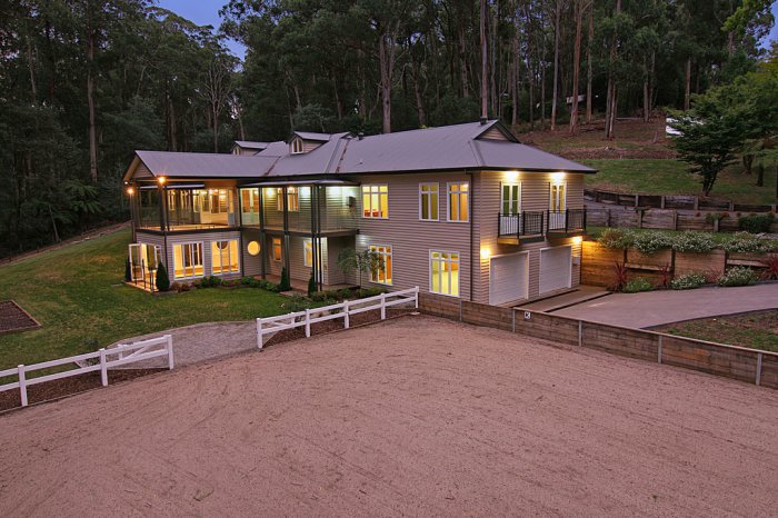 Upon a supremely private 3 acre block (approximately) culminating in Sassafras Creek and with no neighbours, this recently-completed luxury home is what dreams are made of, especially if horses are your passion! The tri-level floorplan of 94 squares (approx) boasts high ceilings with decorative cornices, Sydney Blue Gum floors, brilliant craftsmanship, decadent spaces and the highest-quality fixtures create a home to rival a 5-star hotel. The ground floor welcomes you with an open office, and the formal lounge and dining rooms are segregated by a Heat Charm Victorian wood heater. The family room and kitchen are the highlight for families, with bi-fold doors accessing a stunning alfresco balcony with glass ballustrading to embrace the landscape and views. Be awed by the gourmet kitchen, boasting granite benchtops with recessed sinks, stainless steel Smeg appliances, soft-close drawers, a double-drawer dishwasher and kickboard vacuum, accompanied by a butler’s pantry. The master suite is to-die-for! The enormous bedroom with a private balcony has a walk-in closet/dressing room, Jetmaster gas fireplace and a luxury ensuite bathroom with twin vanities and a claw foot bath overlooking the landscape. Another 4 bedrooms with built-in and walk-in robes share a stunning main bathroom and powder room, 2 with Juliet balconies. The lower ground floor hosts a large laundry with a drying cupboard (and chute), adjoining the massive remote garage/workshop/tack room, complete with heating and 2nd laundry! The fun begins with a fully-wired home theatre with a bar/kitchenette, plus the heated in-ground pool and spa, complete with a change room! The top floor is paradise for children, with a huge rumpus room illuminated by dormer windows, extending to attic storage. Further appointments: hydronic heating through out, including towel rails and under-floor, 2 ducted vacuum systems, 3-phase power and water tanks. This exceptional property also boasts 3 paddocks, stables and sheds, with a full-size Olympic dressage arena, plus a separate 2 bedroom dwelling suitable for short term visitor accommodation. Surprisingly, this serene property is just a short walk/drive from Monbulk town centre, buses and schools!