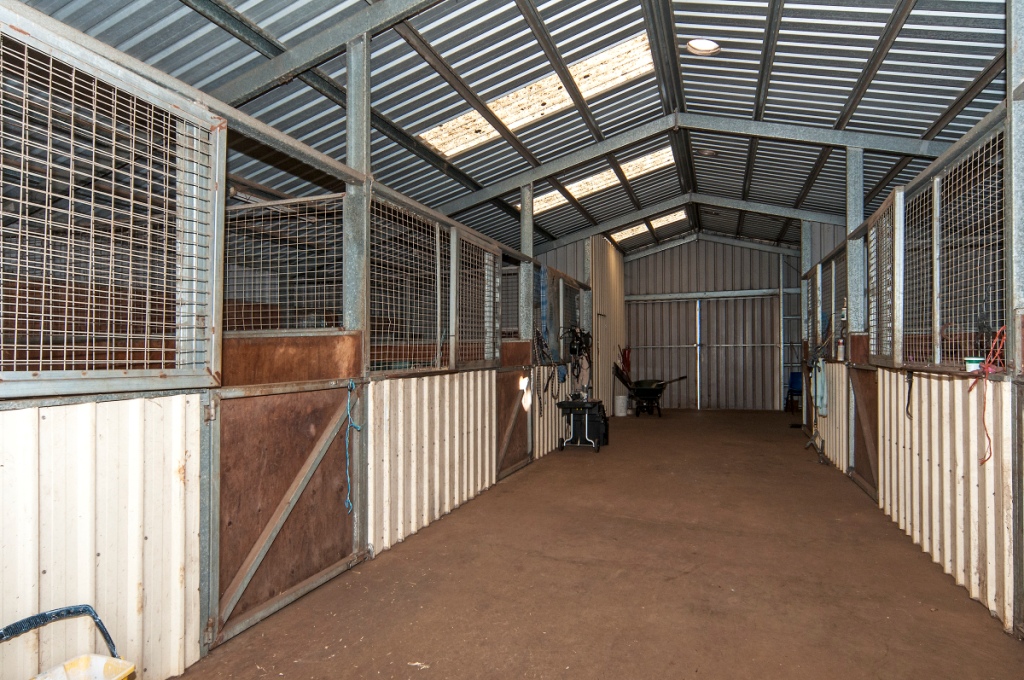 The quality stable complex is approximately 14.5m x 11m in size, fully powered with a drive through central breeze way through wide access sliding doors front and rear. The 3m high clearance Colorbond portal steel frame shed is a fabulous stable complex featuring 6 large stables all professionally lined and divided, perfectly finished to keep the most valuable of horses safe. The complex has a fully lined and fitted out tack and saddle room, plus an area for storage or wash bay at the rear.