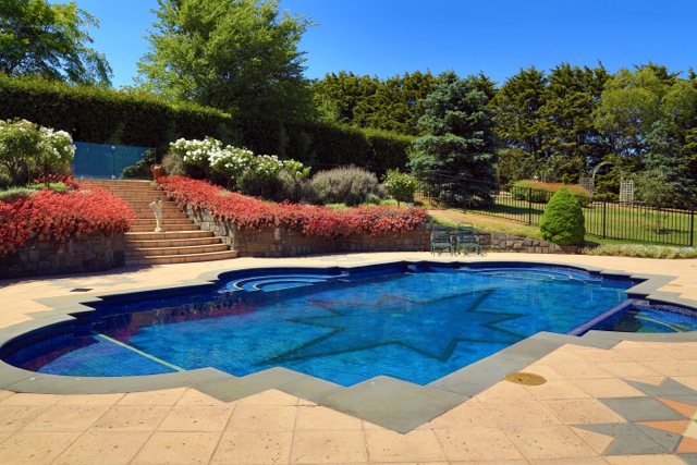 Machinery shed, tiled solar heated pool, BBQ area and artificial turf tennis court (flood lit