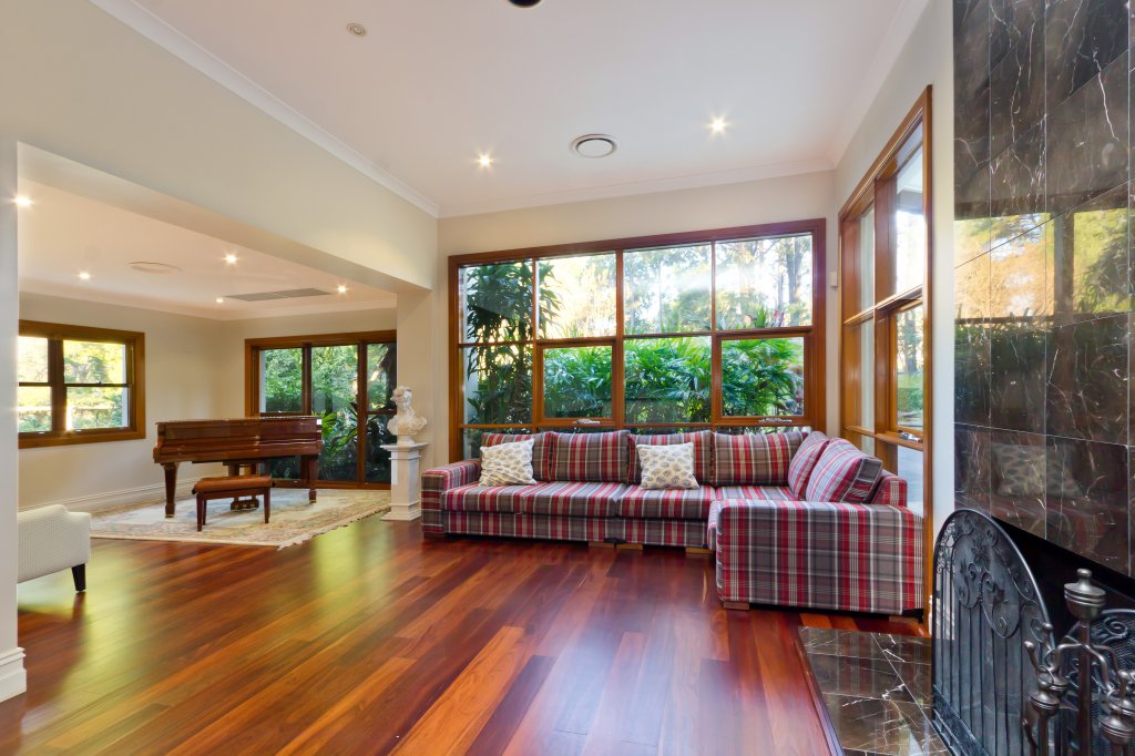 • Formal lounge wrapped in glass, ornate marble fireplace, custom-built timber shelving