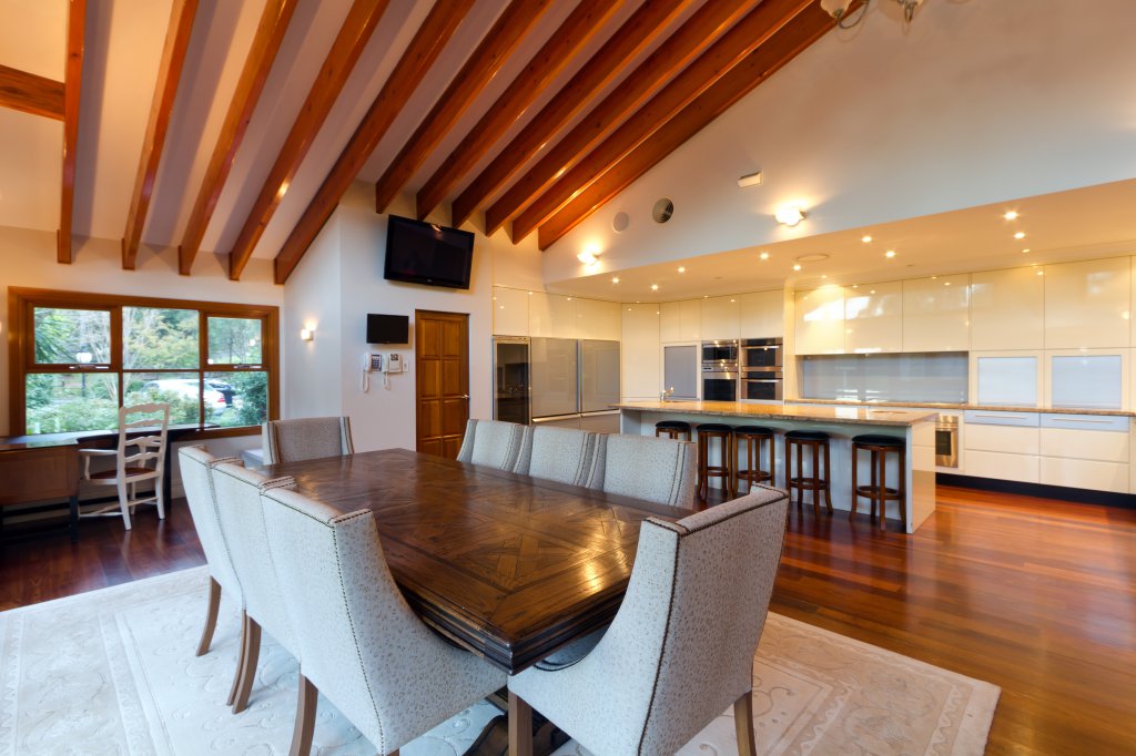 • Sunlit living room features high cathedral ceilings with gorgeous exposed timber beams