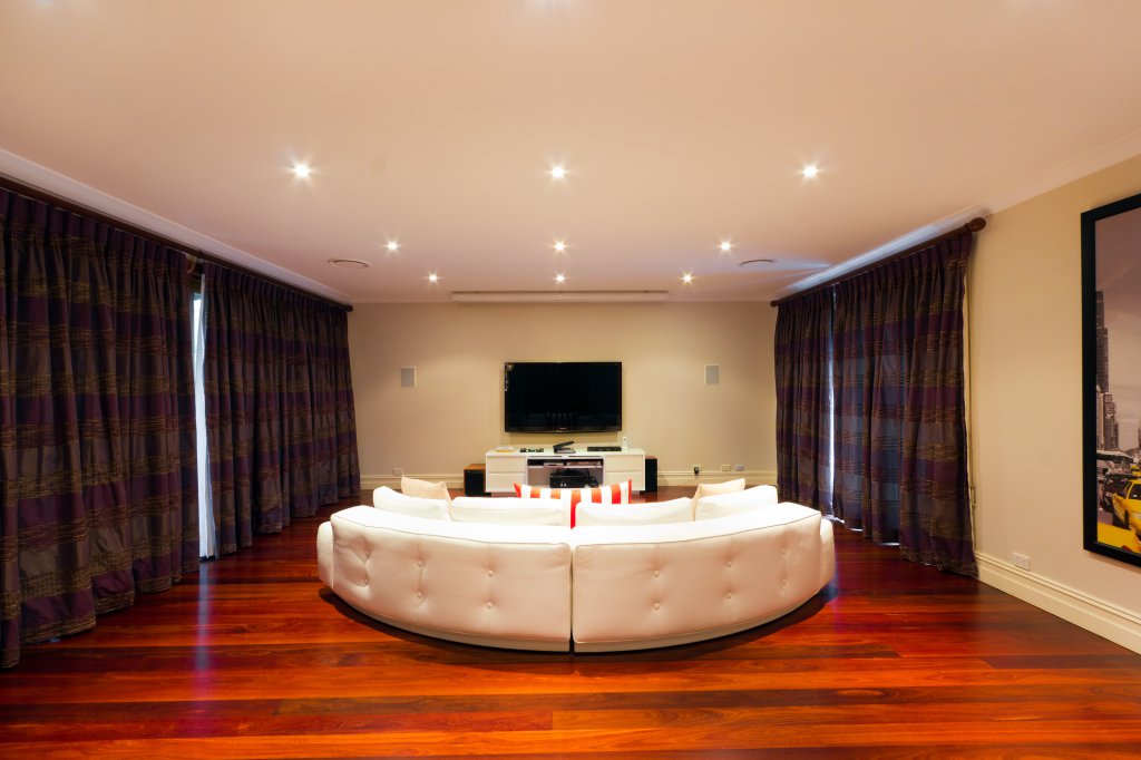 • Luxurious home theatre equipped with integrated sound speakers, access to outside
