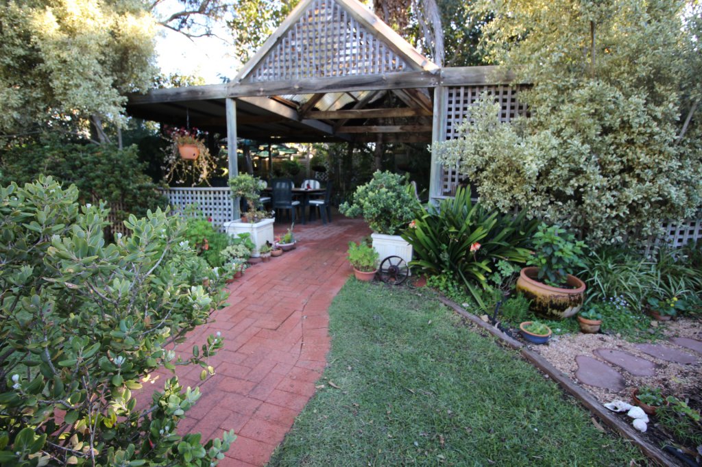 The back yard is very protected with an, almost, tropical feel. Extensive plantings and water features surround the lawn and lead into the enclosed outdoor eating area, set amongst ferns and greenery.
