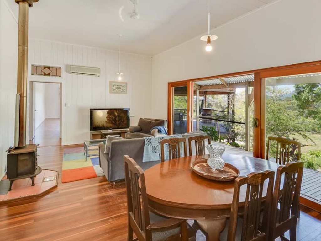 The kitchen has solid timber cupboards and marble bench tops. The lounge is spacious with a combustion heater for those winter nights. There is a central dining area and a central bedroom so common in these older homes, plus a back bedroom that could quite easily be utilised as an office. Main bathroom and separate toilet are also located adjacent to these rooms. The lounge area opens out onto a large rotunda shape entertaining verandah that has beautiful views over the Maroochy River Valley towards Mt Ninderry.