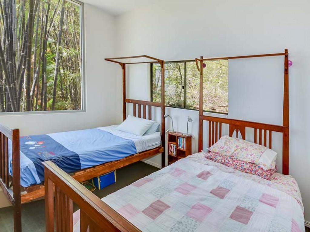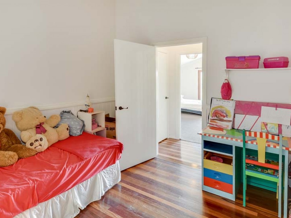 The “new “effectively doubles the size of the house and gives 4 extra-large bedrooms – two up and two down. The main bedroom is very spacious 5.2m x 6 m and leads out onto another verandah which overlooks the valley below. Ensuite has a shower, vanity basin and walk in robe. Adjacent to the main bedroom is another smaller bedroom, but still a spacious 5m x 3.5m that also leads out onto the verandah. Access to downstairs is via an internal timber staircase to almost identical bedrooms as above. Provision has been made for a toilet to be installed between the rooms.