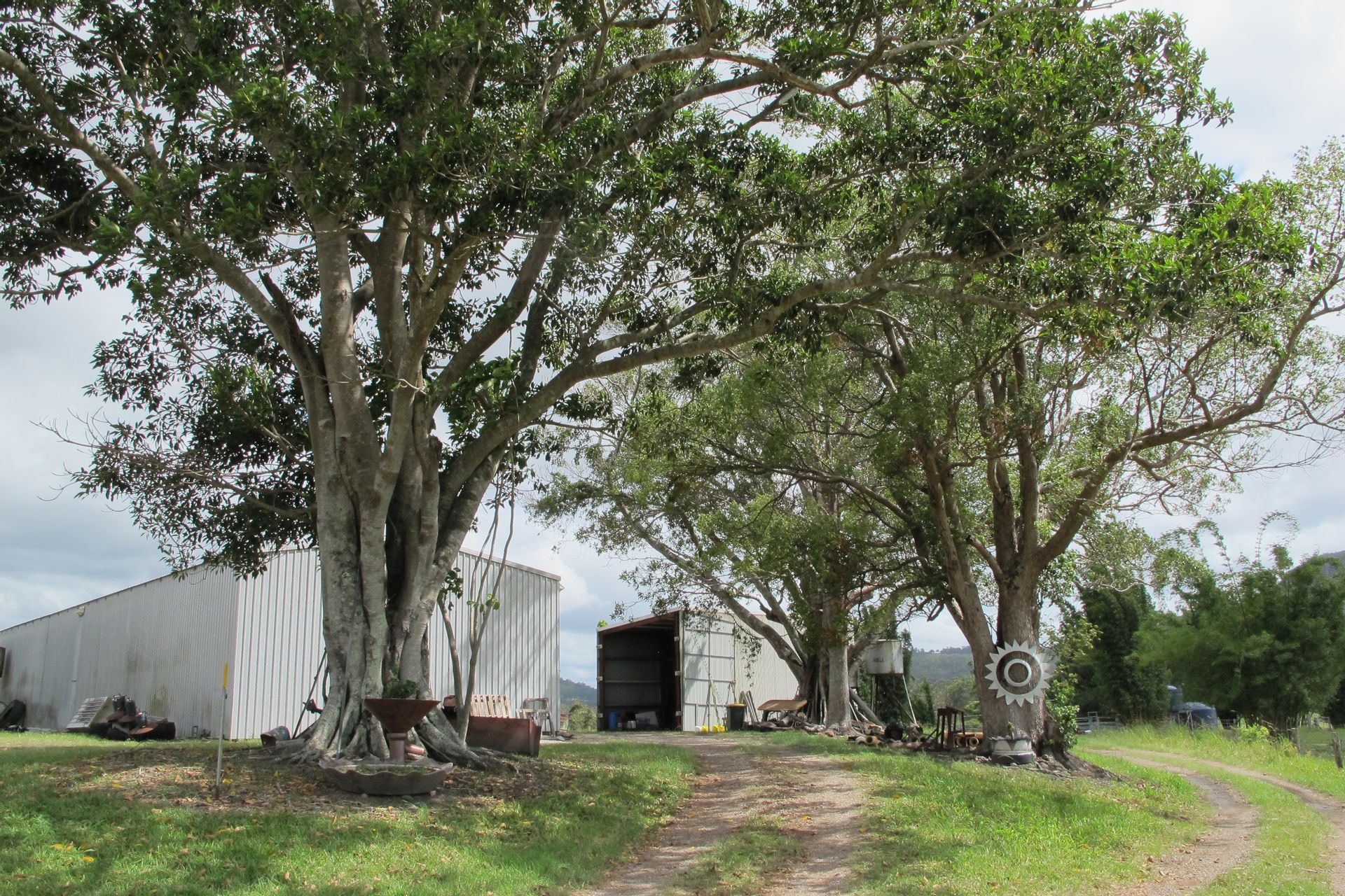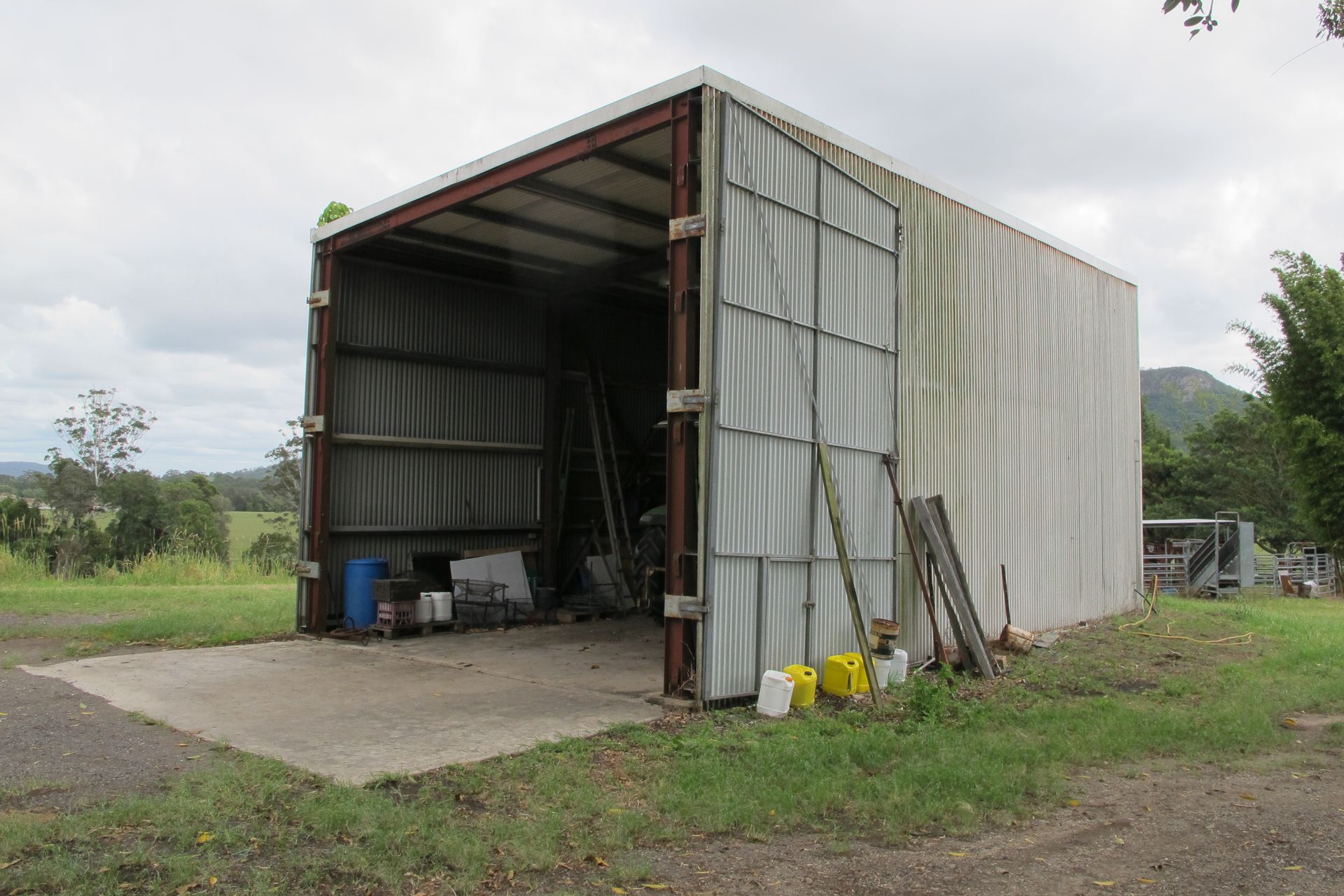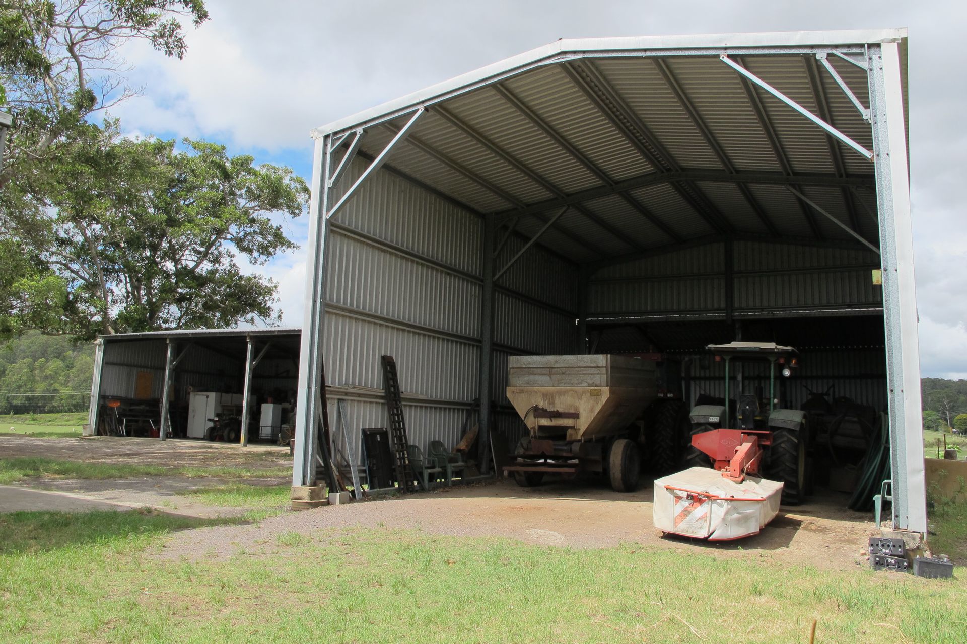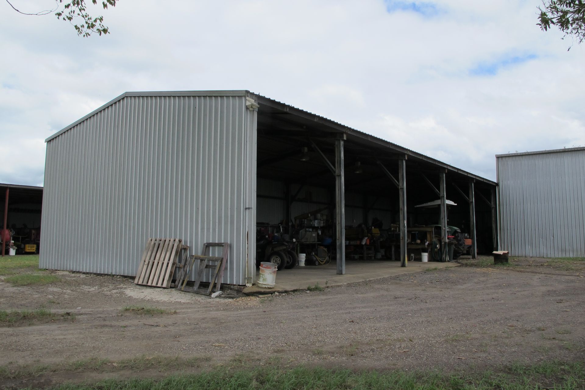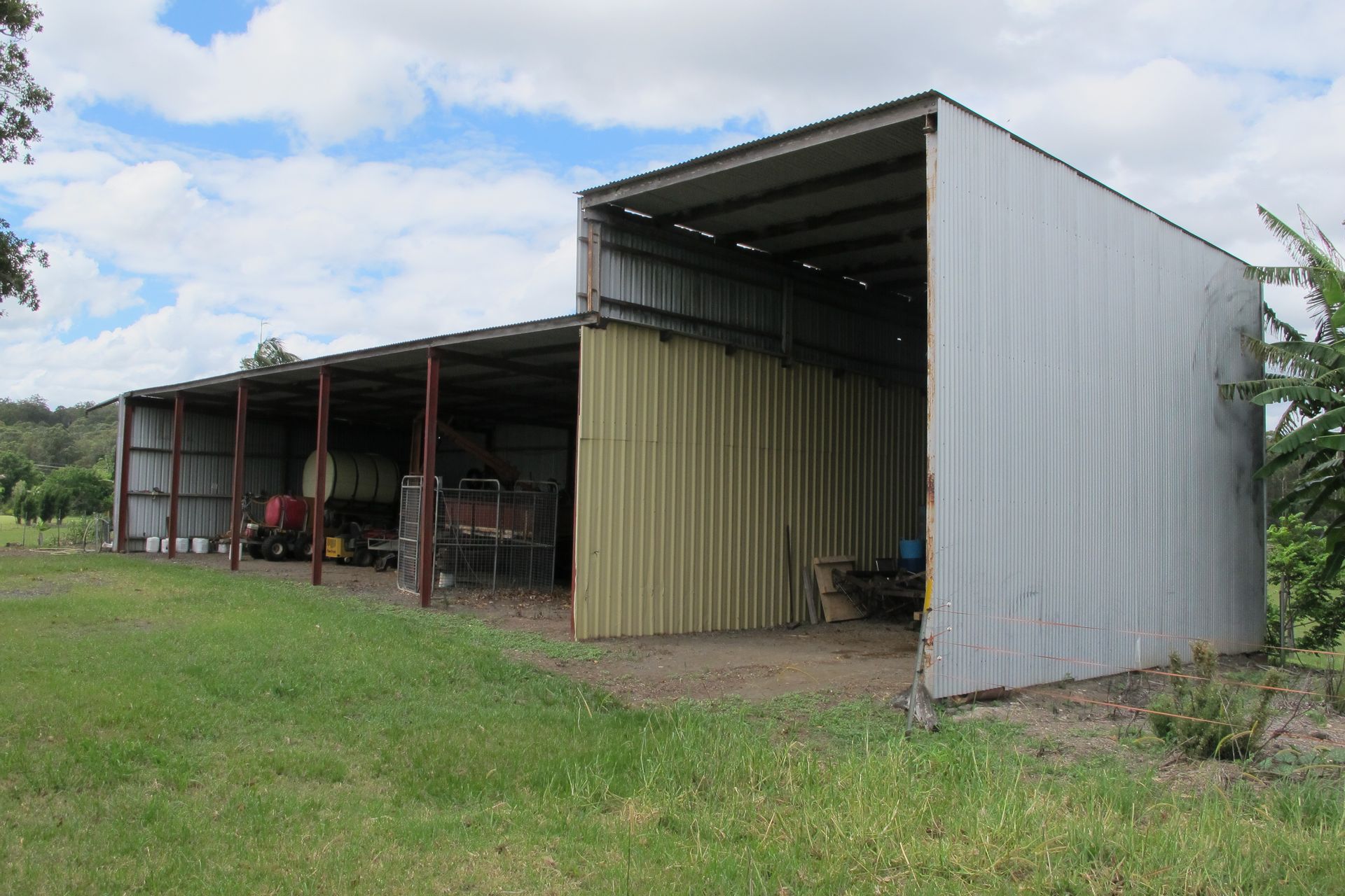 Shed 1 - 24m x 9m, corrugated iron roof and iron cladding, 5 bays, earth floor. The end bay has extra high clearance which was previously used for housing a cane harvester.