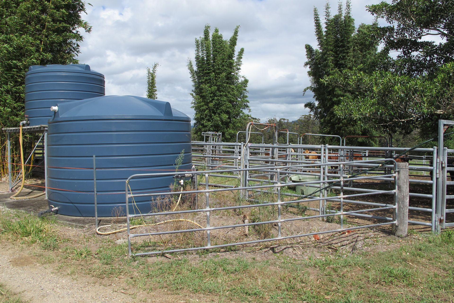 Water is currently water is piped in from a neighbour's large dam to water livestock. There is a 20,000 gallon rainwater tank connected to one shed plus a 5,000 gallon tank that can be used to gravity feed the farm if needed.