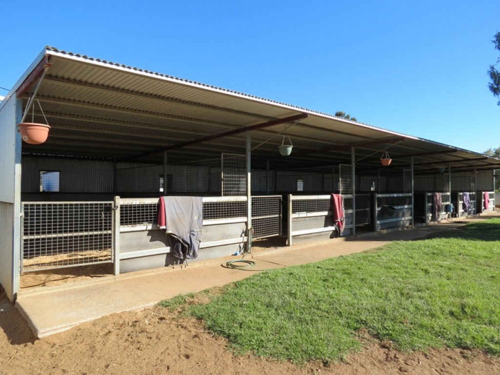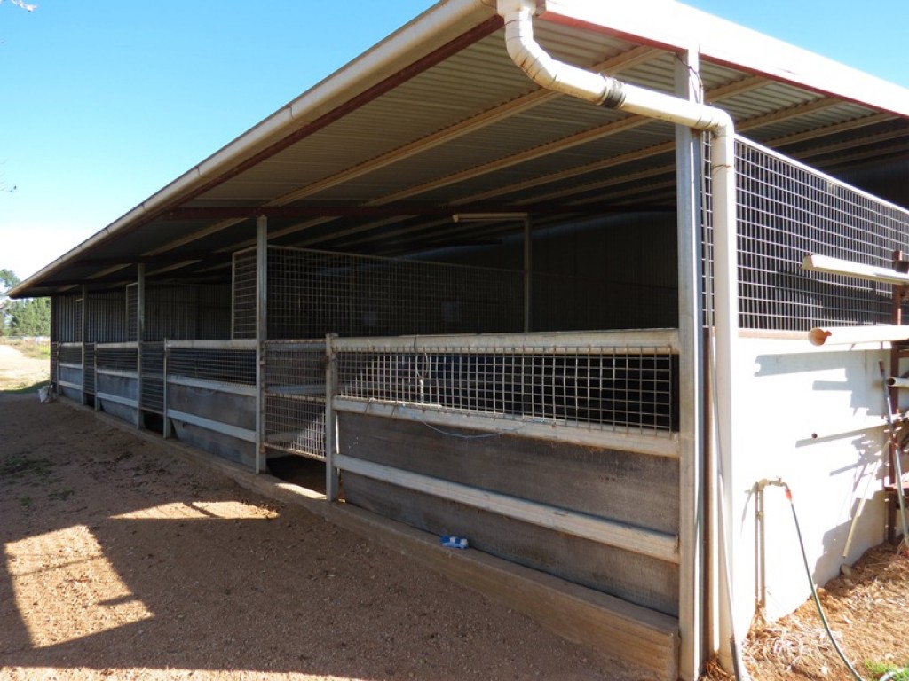 12 large horse boxes, 2 covered yards, 2 tie up stalls, a covered wash bay with hot and cold water, an 8 horse electric walker and round yard.