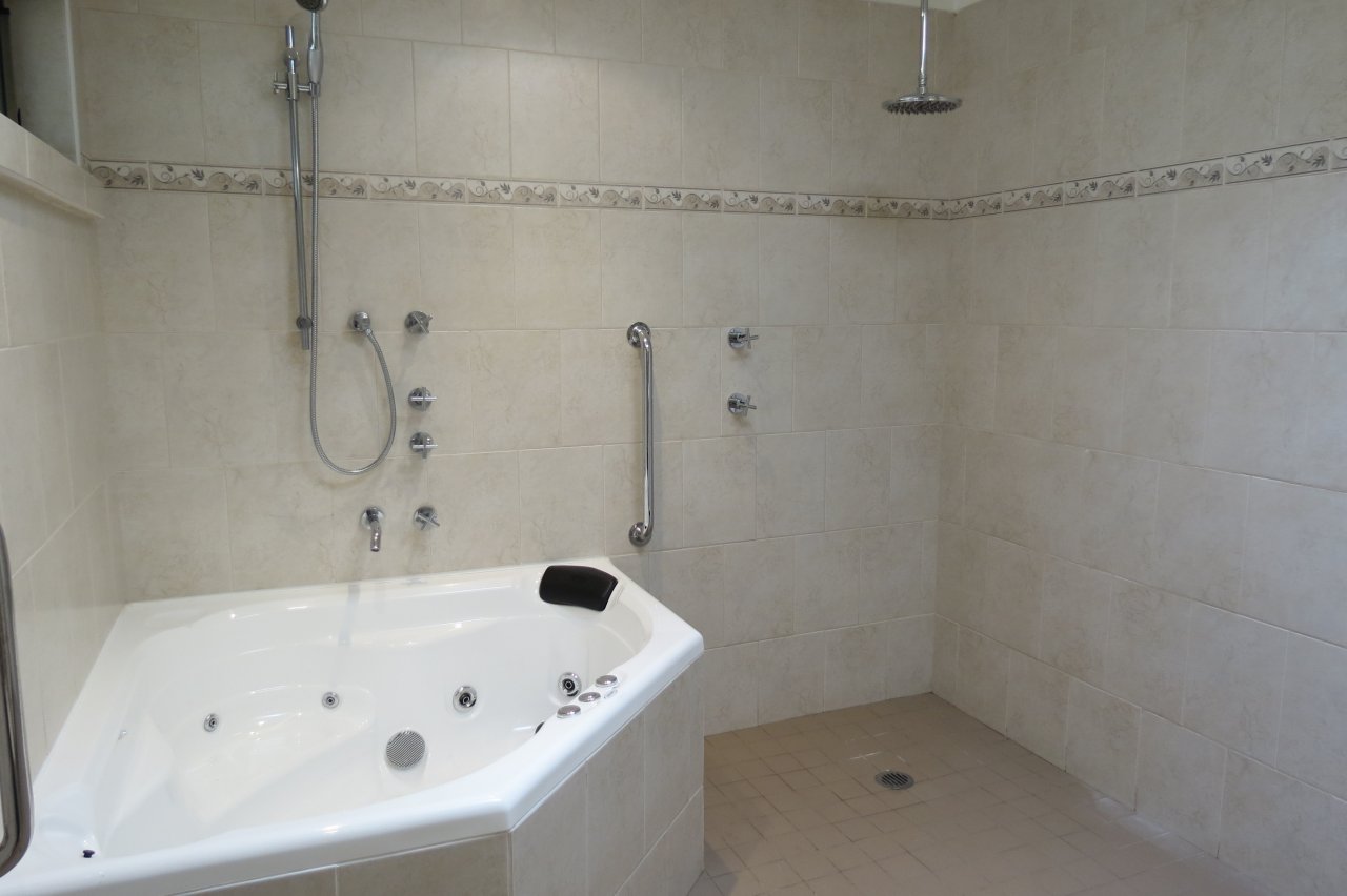 The main bathroom is impressive with large corner spa with overhead shower and a second wet room style shower drop, heated towel rails and bidet.