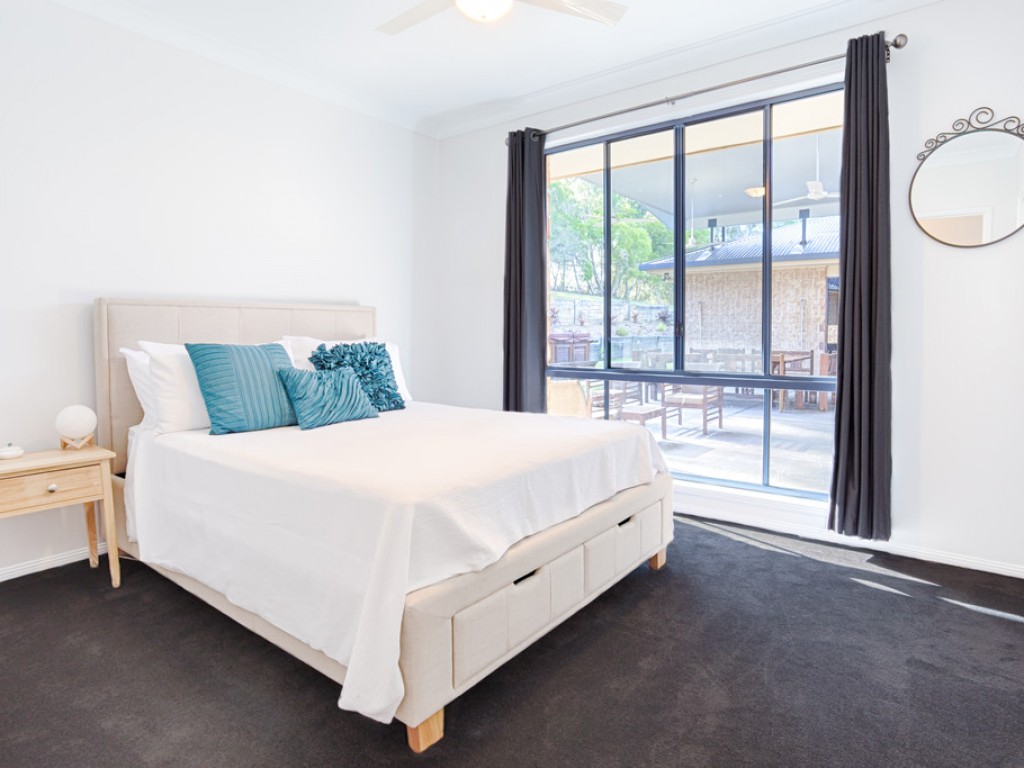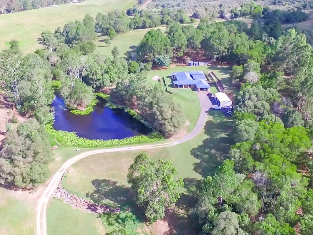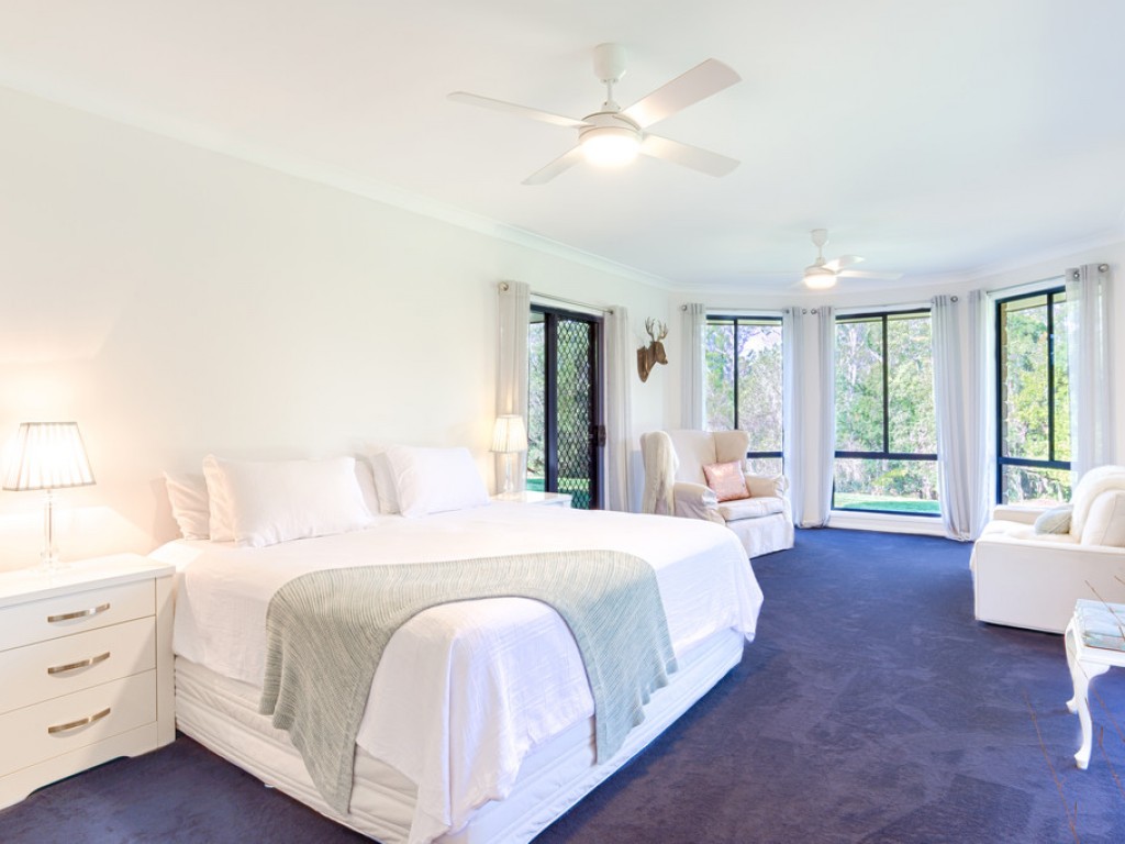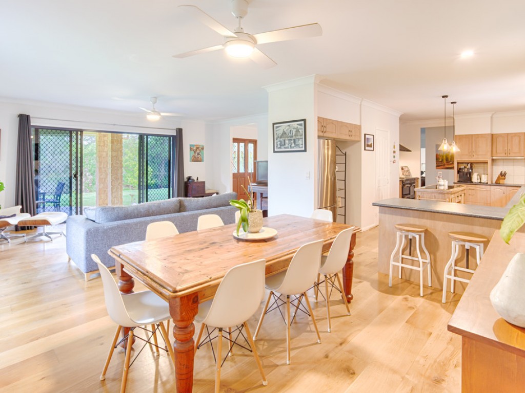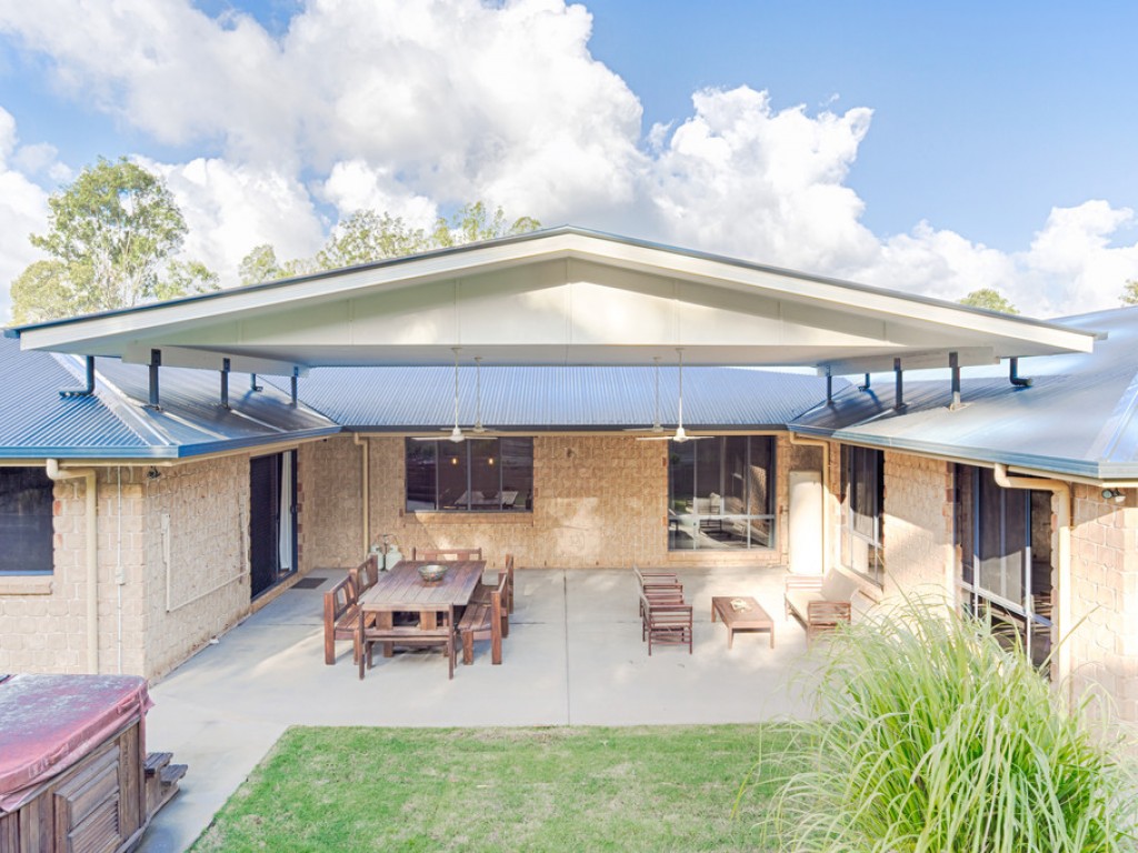 The home is lowset for effortless living and good functionality for all ages; and is complete with five king-size bedrooms, three bathrooms, purpose-built study, three separate living areas, well-equipped central kitchen with 8-burner gas cooktop, east-facing alfresco terrace overlooking arguably one of the hinterland's most picturesque dams complete with it's own island (inspiring the Monet in all of us), wraparound front terrace with winter patio at front of home, and double lock up remote garage.
