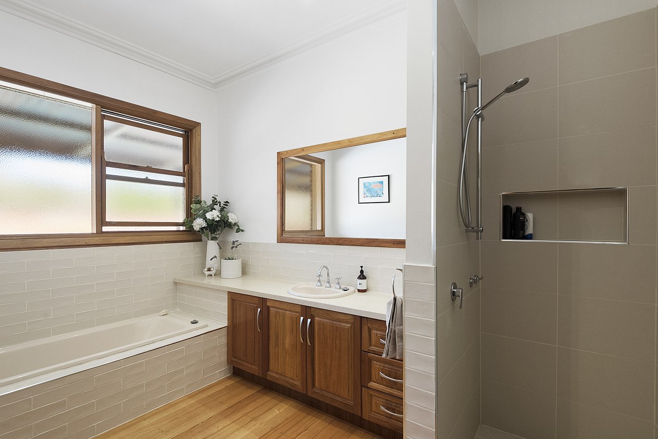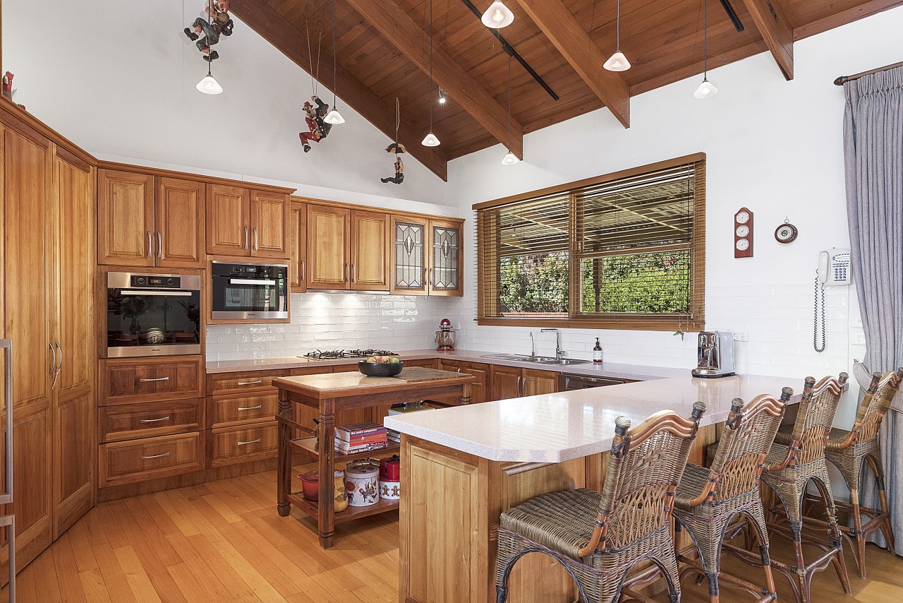 In between is an enormous open plan living zone under timber lined cathedral ceilings that complement Vic Ash floors. With an open fireplace, ducted heating and a split system unit ensuring year-round comfort and light filled thanks to premium Velux skylights, it includes a solid timber Miele equipped, stone kitchen ready to cope with every event.