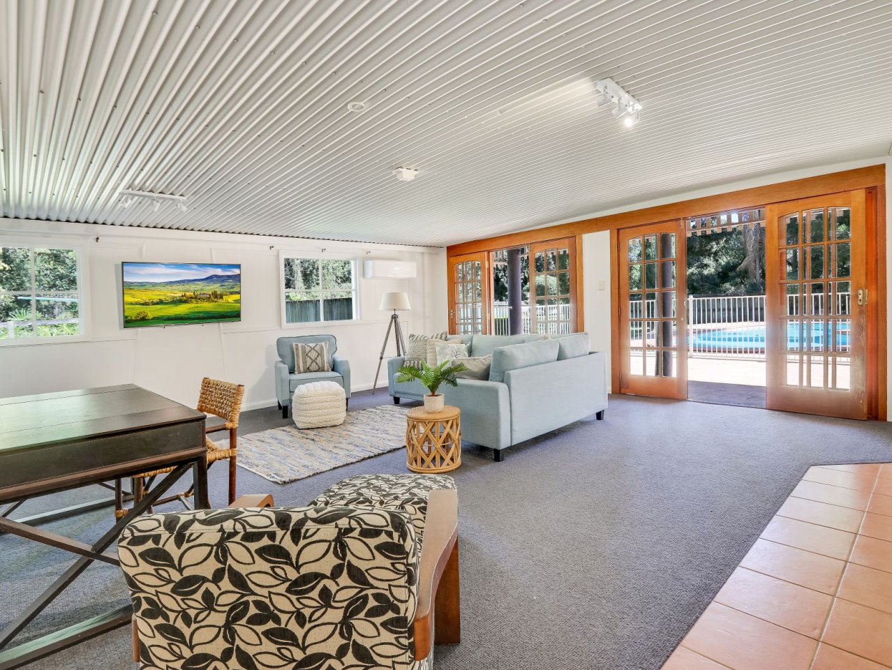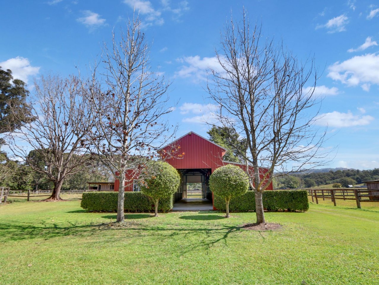 * Fully equipped hardwood Stables, complete with 8 stalls, tack room, wash bay, feed room with