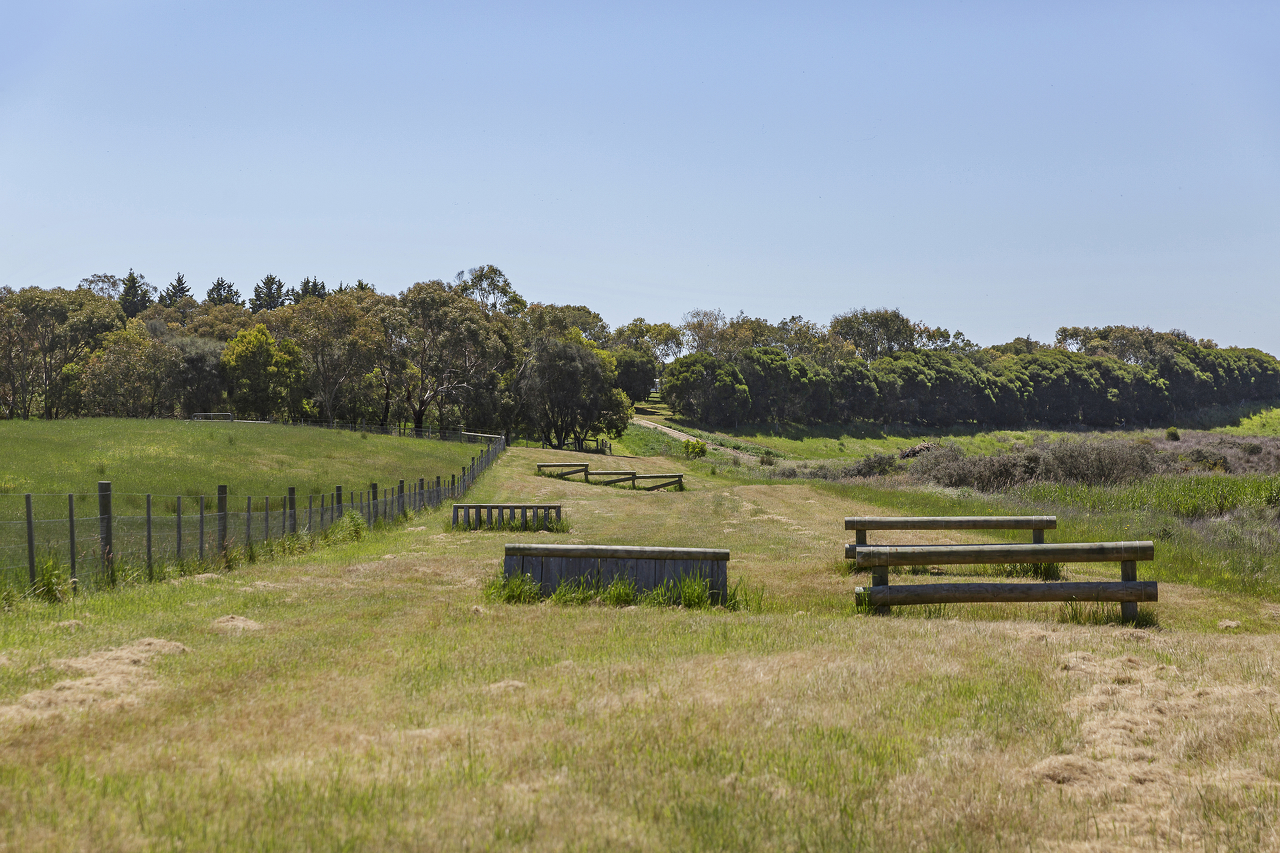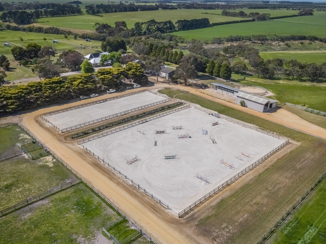 The equestrian facilities include a 20x60m dressage arena, 50x60m jumping arena, round yard, stables, wash bay, truck and float garage, tack and feed rooms, hay store, 18 post and rail paddocks (12 with shelters) and two hay paddocks. A riding trail and cross-country course wind around the property.