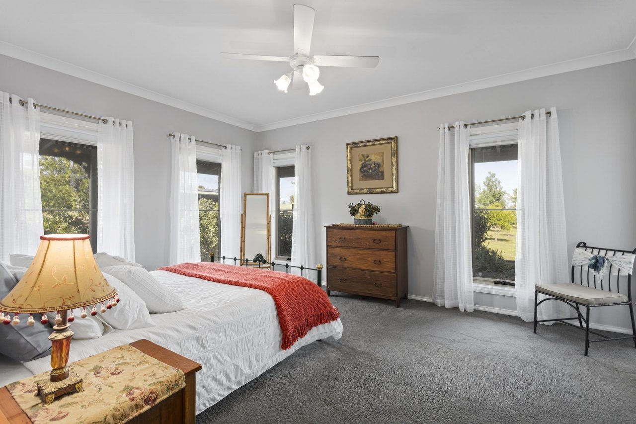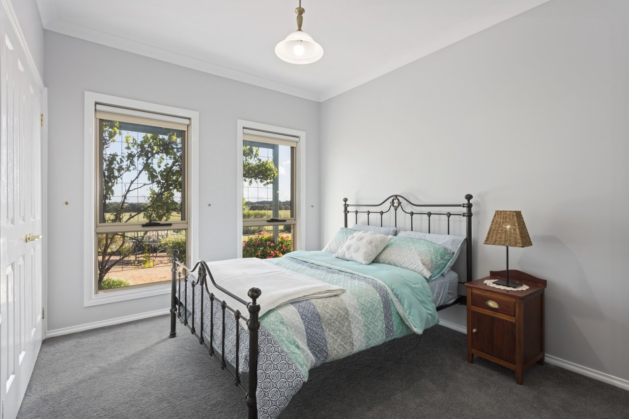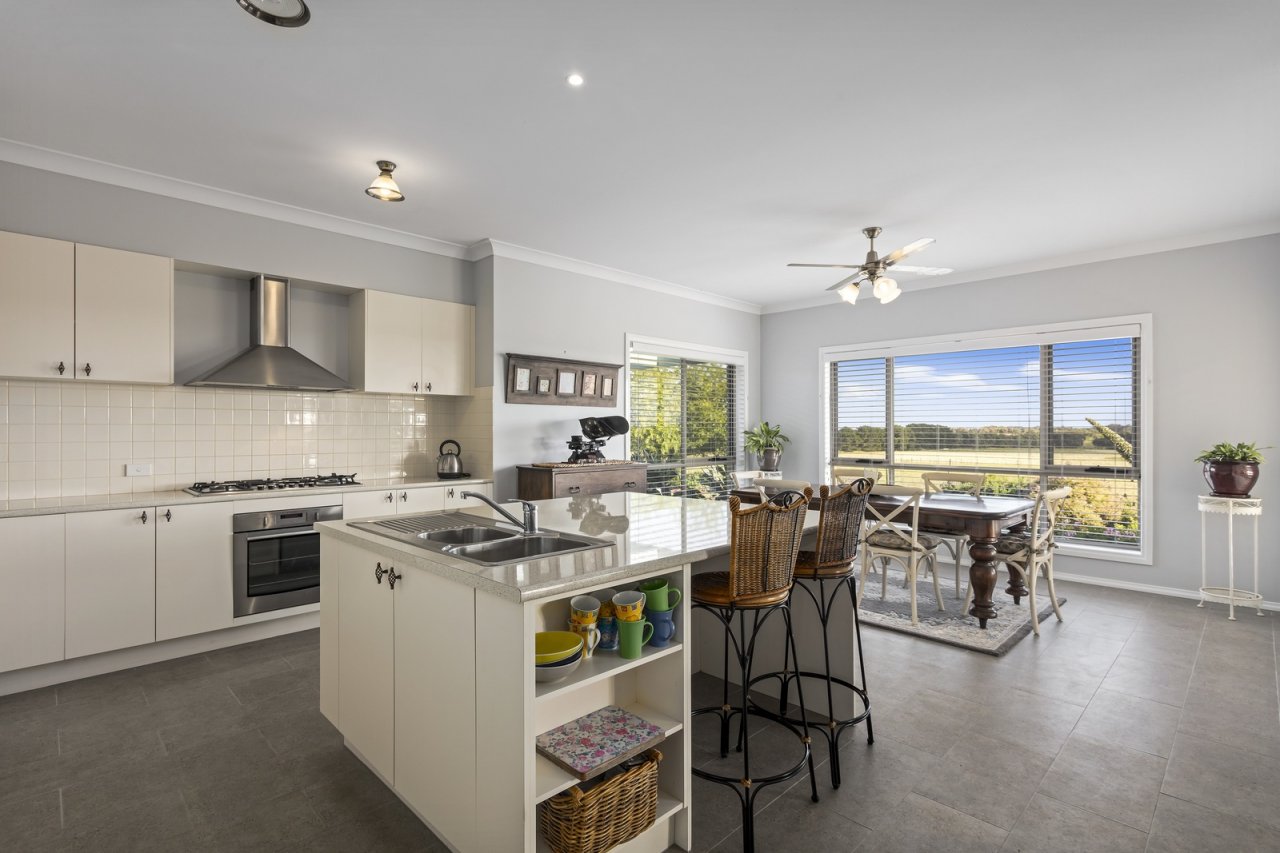 This 10-year-old luxurious four bedrooms plus study home has been recently updated - repainted throughout, new quality floor tiles, carpet and window furnishings - to create a charming, modern country style property. The master bedroom suite includes a full ensuite and large walk in robe. The very well-appointed kitchen is truly the hub of the home and boasts plentiful storage, two 600 mm ovens (one gas, one electric), a six burner gas cook top including two wok burners, dishwasher and large island bench. This area is open plan and includes a casual dining area and spacious informal lounge. Ambience is provided by the wood heater and large north facing windows where you can see for miles and watch your livestock grazing contentedly in the paddocks. Stepping out onto the outdoor entertaining area you can dine al fresco, read a book or just sit and take in the fresh country air. For a more formal occasion, a sense of grandeur can be felt in the formal lounge and dining room situated off the front entrance.