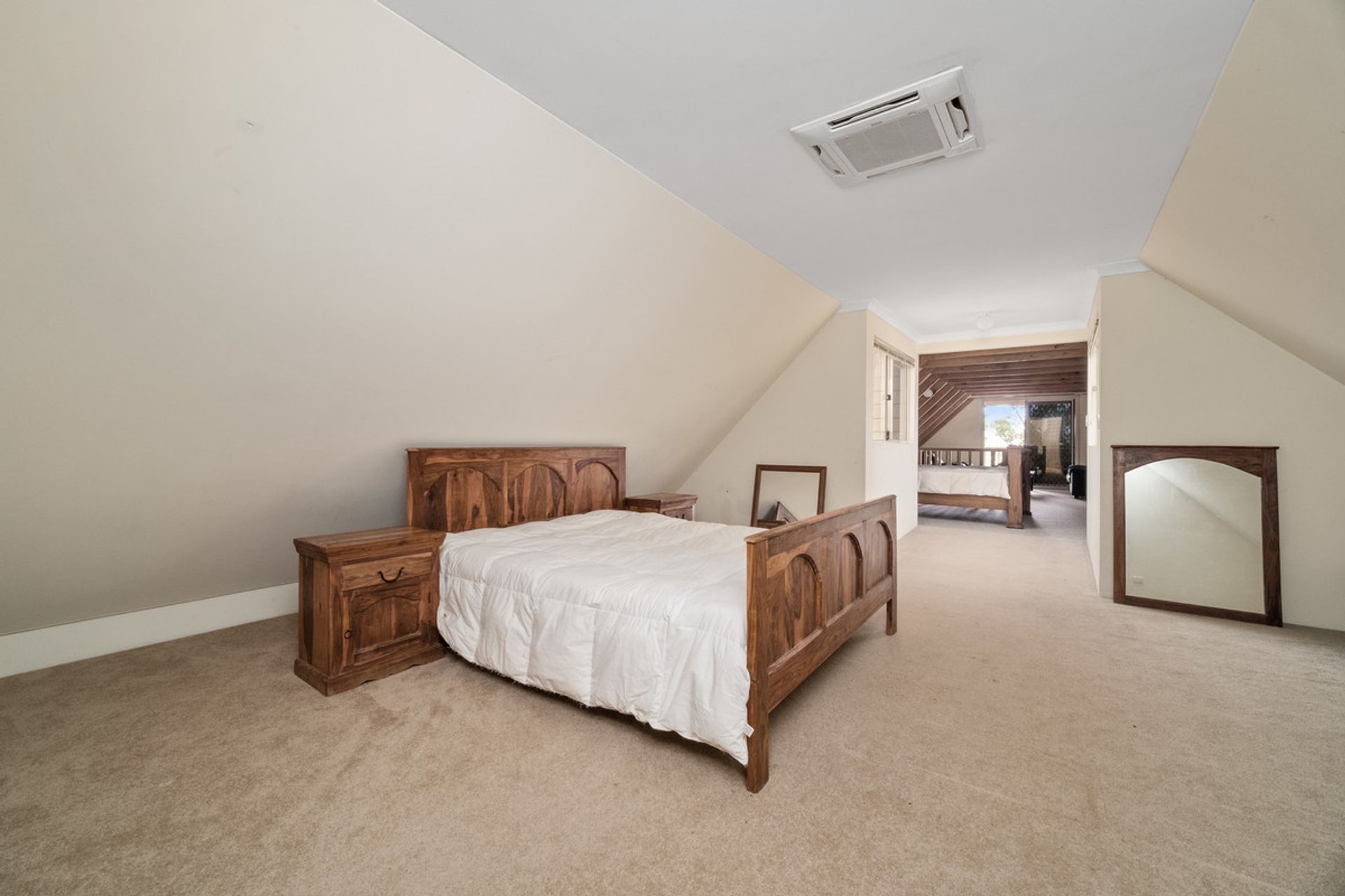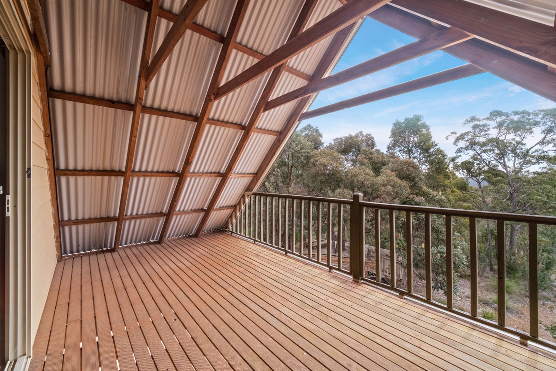 Enter the main dwelling to a kitchen which overlooks a cosy lounge area. The kitchen has a central island bench with a gorgeous timber bench top and feature stonework finish and spacious pantry. A practical combined bathroom and laundry is also located on this level. Make your way up the timber staircase to find the main accommodation wing, along with a second living area. This area spans the entire top floor of the dwelling and is flexible in its layout. Raked ceilings add charm and character to this great space and ducted evaporative air conditioning ensures summer comfort. A handy storage room on this level, with existing toilet powder room provides the option to easily add another bathroom should it be required. Glass sliding doors from the second living area give direct access out to a wide balcony which has a pretty view over the property and the Regal Hills Water Supply catchment.