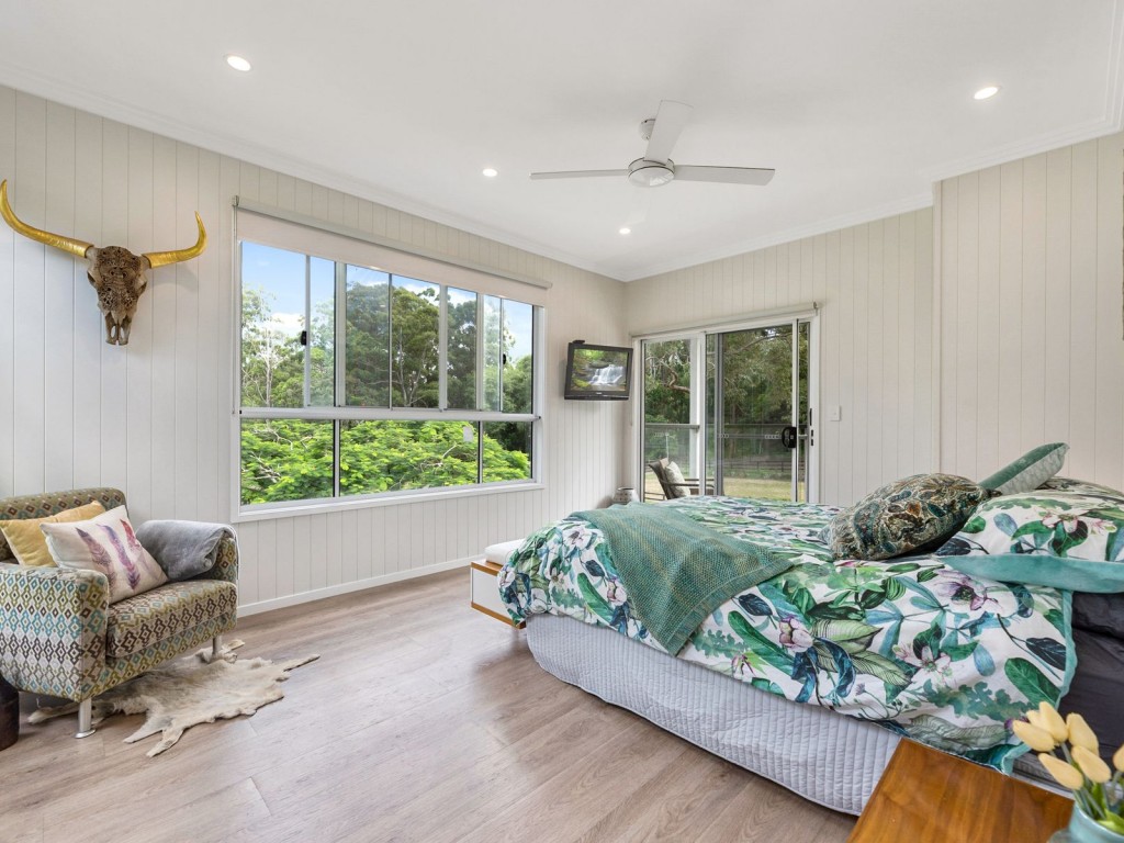 : The main bedroom with ceiling fan and AC overlooks the paddocks, has an extra-large walk-in robe and designer ensuite